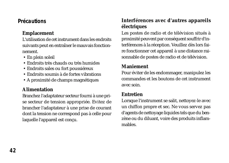 Ne placez jamais de récipient contenant du li-quide près de l'instrument. Si le liquide se ren-verse ou coule, il risque de provoquer des dom-mages, un court-circuit ou une électrocution.
