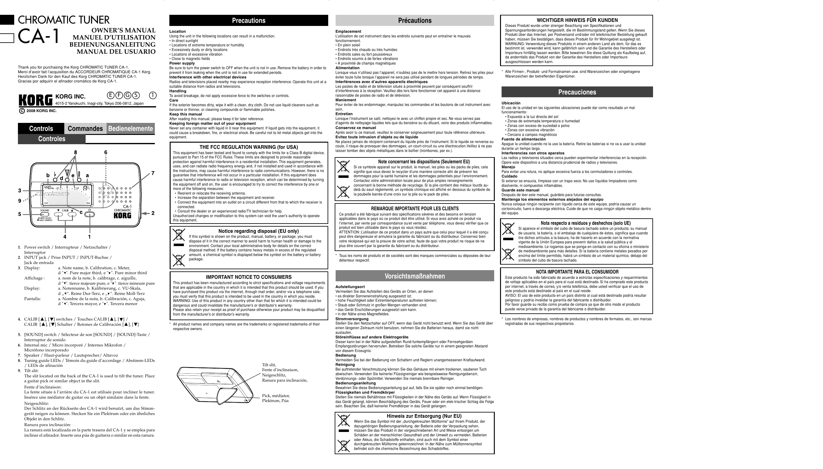Thank you for purchasing the Korg CHROMATIC TUNER CA-1. Merci d'avoir fait l'acquisition du ACCORDEUR CHROMATIQUE CA-1 Korg. Herzlichen Dank für den Kauf des Korg CHROMATIC TUNER CA-1. Gracias por adquirir el afinador cromatico de Korg CA-1.