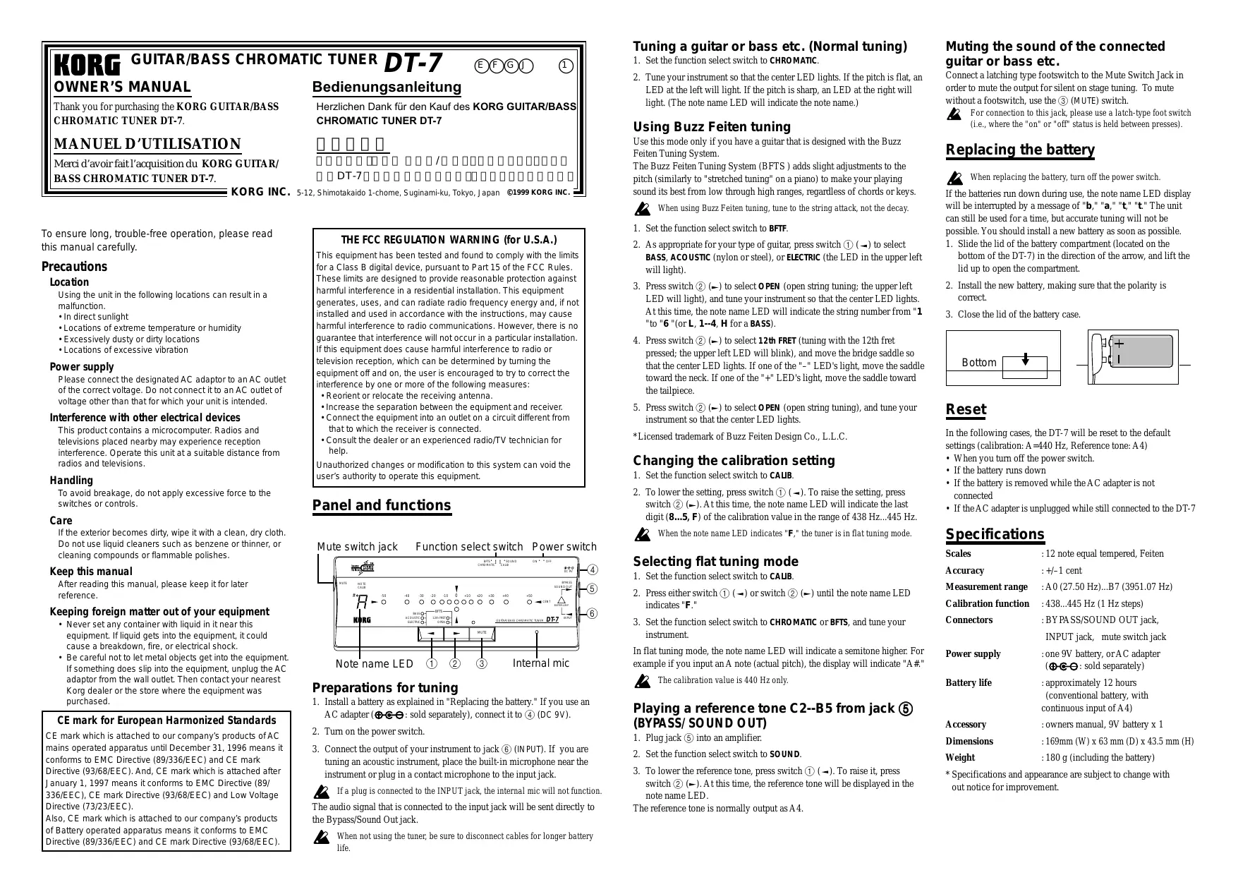| KORG GUITAR/BASS CHROMATIC TUNER DT-7 E F G J 1 OWNER'S MANUAL Bedienungsanleitung Thank you for purchasing the KORG GUITAR/BASS Herzlichen Dank für den Kauf des KORG GUITAR/BASS CHROMATIC TUNER DT-7. CHROMATIC TUNER DT-7 MANUEL D'UTILISATION Merci d'avoir fait l'acquisition du KORG GUITAR/ / BASS CHROMATIC TUNER DT-7. DT-7 KORG INC. 5-12, Shimotakaido 1-chome, Suginami-ku, Tokyo, Japan @1999 KORG INC. |