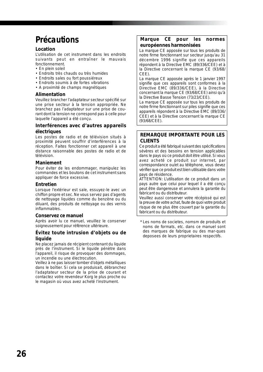 La marque CE apposse sur tous les produits de notre firme fonctionnant sur piles signifie que ces appeareils repondent à la Directive EMC (89/336/CEE) et à la Directive concernant la marque CE (93/68/CEE).