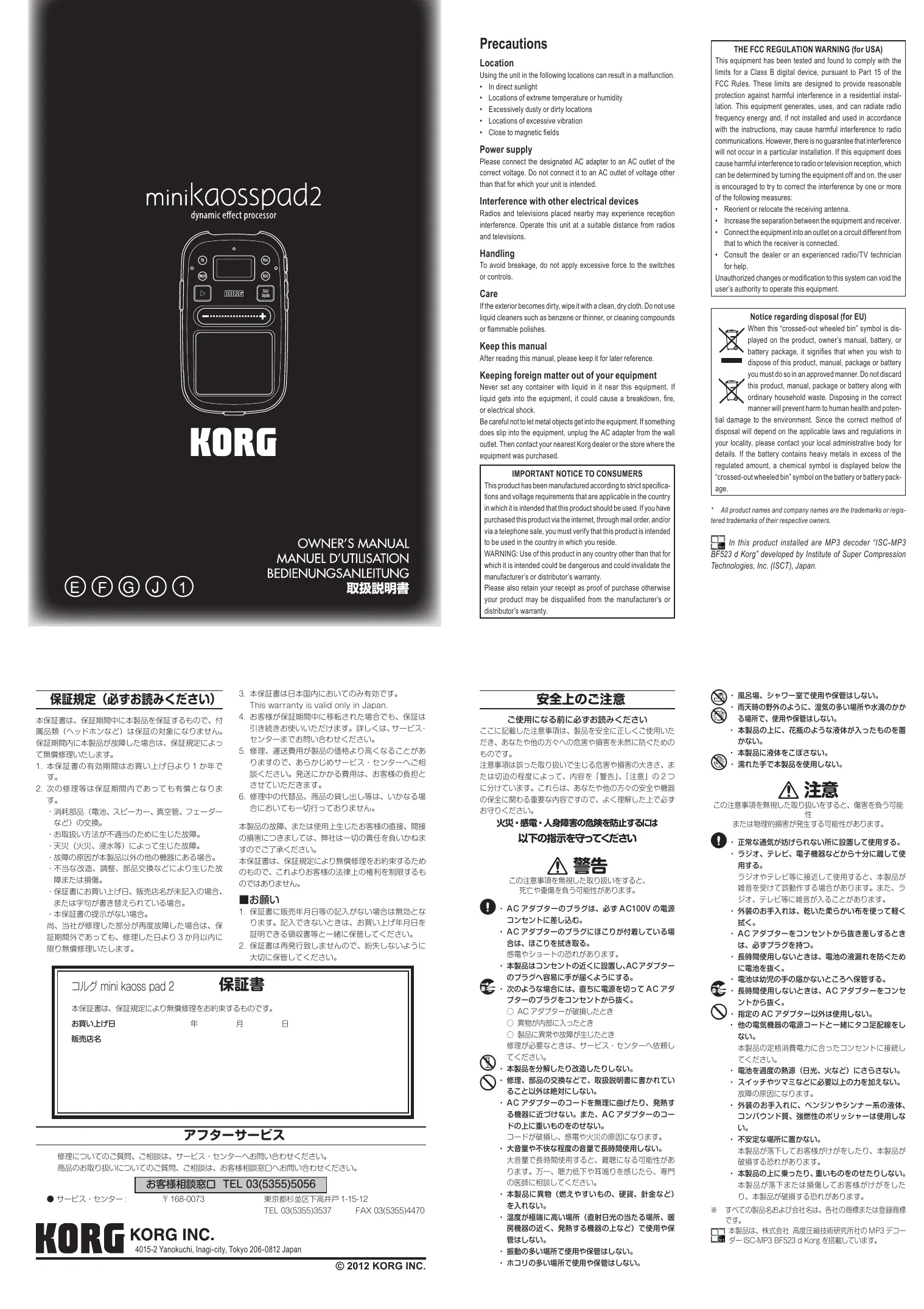 Retrouvez gratuitement la notice de l'appareil MINI KAOSS PAD 2 KORG au format PDF.