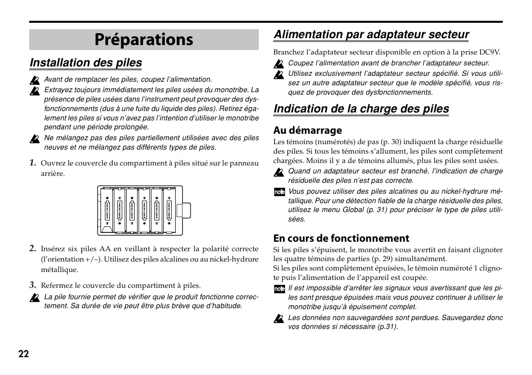 Au démarrage Les témoins (numérotés) de pas (p. 30) indiquent la charge résiduelle des piles. Si tous les témoins s’allument, les piles sont complètement chargées. Moins il y a de témoins allumés, plus les piles sont usées. Quand un adaptateur secteur est branché, l’indication de charge résiduelle des piles n’est pas correcte. Vous pouvez utiliser des piles alcalines ou au nickel-hydrure métallique. Pour une détection fiable de la charge résiduelle des piles, utilisez le menu Global (p. 31) pour préciser le type de piles utilisées.