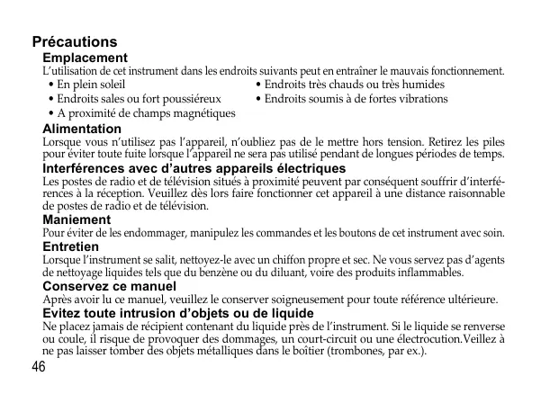 Emplacement L’utilisation de cet instrument dans les endroits suivants peut en entraîner le mauvais fonctionnement. • En plein soleil • Endroits très chauds ou très humides • Endroits sales ou fort poussiéreux • Endroits soumis à de fortes vibrations • A proximité de champs magnétiques