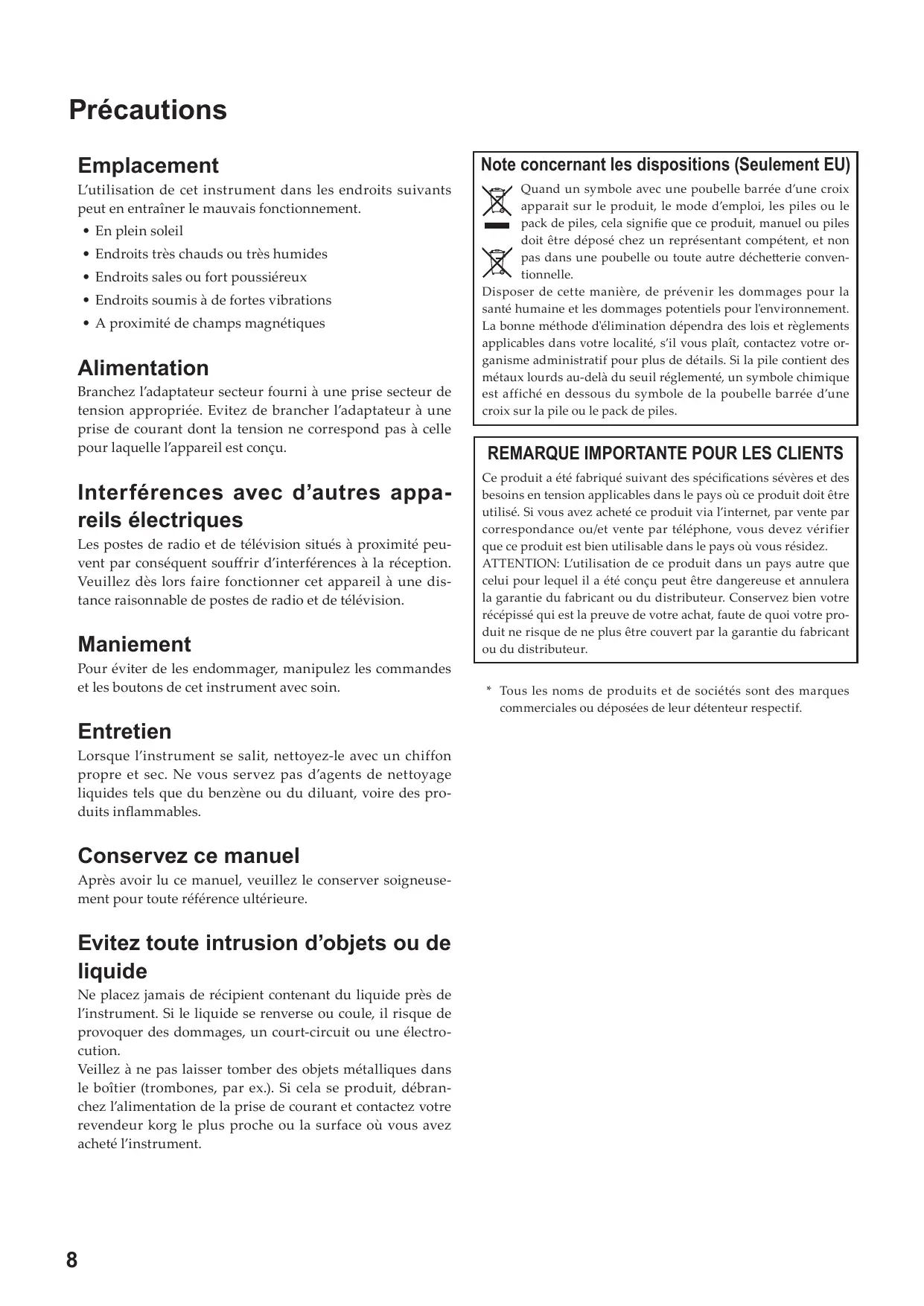 - A proximité de champs magnétiques Alimentation Branchez l’adaptateur secteur fourni à une prise secteur de tension appropriée. Evitez de brancher l’adaptateur à une prise de courant dont la tension ne correspond pas à celle pour laquelle l’appareil est conçu. Interférences avec d’autres appareils électriques Les postes de radio et de télévision situés à proximité peuvent par conséquent souffrir d’interférences à la réception. Veuillez dès lors faire fonctionner cet appareil à une distance raisonnable de postes de radio et de télévision. Maniement Pour éviter de les endommager, manipulez les commandes et les boutons de cet instrument avec soin. Entretien Lorsque l’instrument se salit, nettoyez-le avec un chiffon propre et sec. Ne vous servez pas d’agents de nettoyage liquides tels que du benzène ou du diluant, voire des produits inflammables. Conservez ce manuel Après avoir lu ce manuel, veuillez le conserver soigneusement pour toute référence ultérieure. Evitez toute intrusion d’objets ou de liquide Ne placez jamais de récipient contenant du liquide près de l’instrument. Si le liquide se renverse ou coule, il risque de provoquer des dommages, un court-circuit ou une électrocution. Veillez à ne pas laisser tomber des objets métalliques dans le boîtier (trombones, par ex.). Si cela se produit, débranchez l’alimentation de la prise de courant et contactez votre revendeur korg le plus proche ou la surface où vous avez acheté l’instrument.