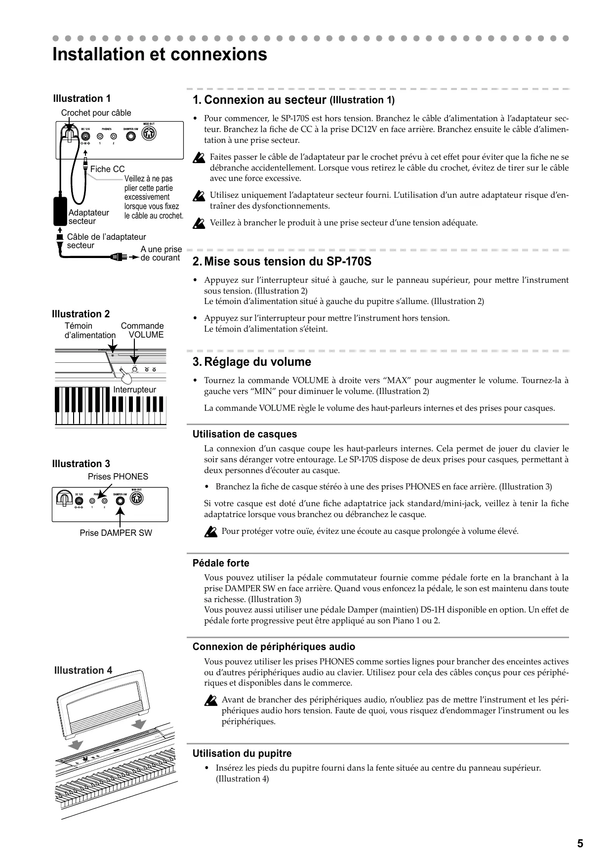 - Branchez la fiche de casque stéréo à une des prises PHONES en face arrière. (Illustration 3) Si votre casque est doté d’une fiche adaptatrice jack standard/mini-jack, veillez à tenir la fiche adaptatrice lorsque vous branchez ou débranchez le casque. Prise DAMPER SW Pour protéger votre ouïe, évitez une écoute au casque prolongée à volume élevé. Pédale forte Vous pouvez utiliser la pédale commutateur fournie comme pédale forte en la branchant à la prise DAMPER SW en face arrière. Quand vous enfoncez la pédale, le son est maintenu dans toute sa richesse. (Illustration 3) Vous pouvez aussi utiliser une pédale Damper (maintien) DS-1H disponible en option. Un effet de pédale forte progressive peut être appliqué au son Piano 1 ou 2. Connexion de périphériques audio Illustration 4 Vous pouvez utiliser les prises PHONES comme sorties lignes pour brancher des enceintes actives ou d’autres périphériques audio au clavier. Utilisez pour cela des câbles conçus pour ces périphériques et disponibles dans le commerce. Avant de brancher des périphériques audio, n’oubliez pas de mettre l’instrument et les périphériques audio hors tension. Faute de quoi, vous risquez d’endommager l’instrument ou les périphériques. Utilisation du pupitre
