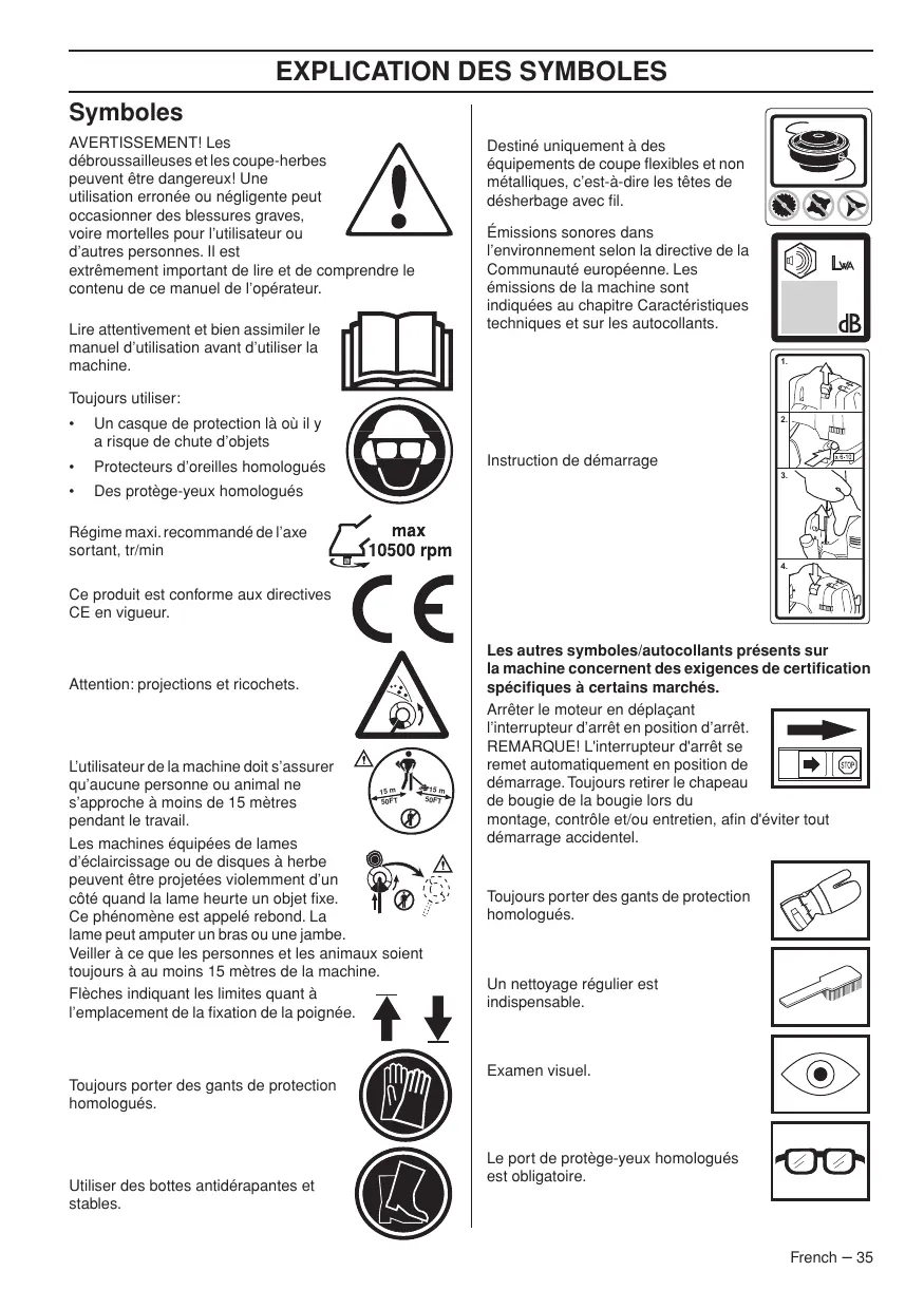 Ce produit est conforme aux directives CE en vigueur. Attention: projections et ricochets. L’utilisateur de la machine doit s’assurer qu’aucune personne ou animal ne 15 m 15 m 50FT 50FT s’approche à moins de 15 mètres pendant le travail. Les machines équipées de lames d’éclaircissage ou de disques à herbe peuvent être projetées violemment d’un côté quand la lame heurte un objet fixe. Ce phénomène est appelé rebond. La lame peut amputer un bras ou une jambe. Veiller à ce que les personnes et les animaux soient toujours à au moins 15 mètres de la machine. Flèches indiquant les limites quant à l’emplacement de la fixation de la poignée. Les autres symboles/autocollants présents sur la machine concernent des exigences de certification spécifiques à certains marchés. Arrêter le moteur en déplaçant l’interrupteur d’arrêt en position d’arrêt. REMARQUE! L'interrupteur d'arrêt se remet automatiquement en position de démarrage. Toujours retirer le chapeau de bougie de la bougie lors du montage, contrôle et/ou entretien, afin d'éviter tout démarrage accidentel. Toujours porter des gants de protection homologués. Un nettoyage régulier est indispensable. Examen visuel. Toujours porter des gants de protection homologués. Utiliser des bottes antidérapantes et stables. Le port de protège-yeux homologués est obligatoire. French – 35 SOMMAIRE Sommaire