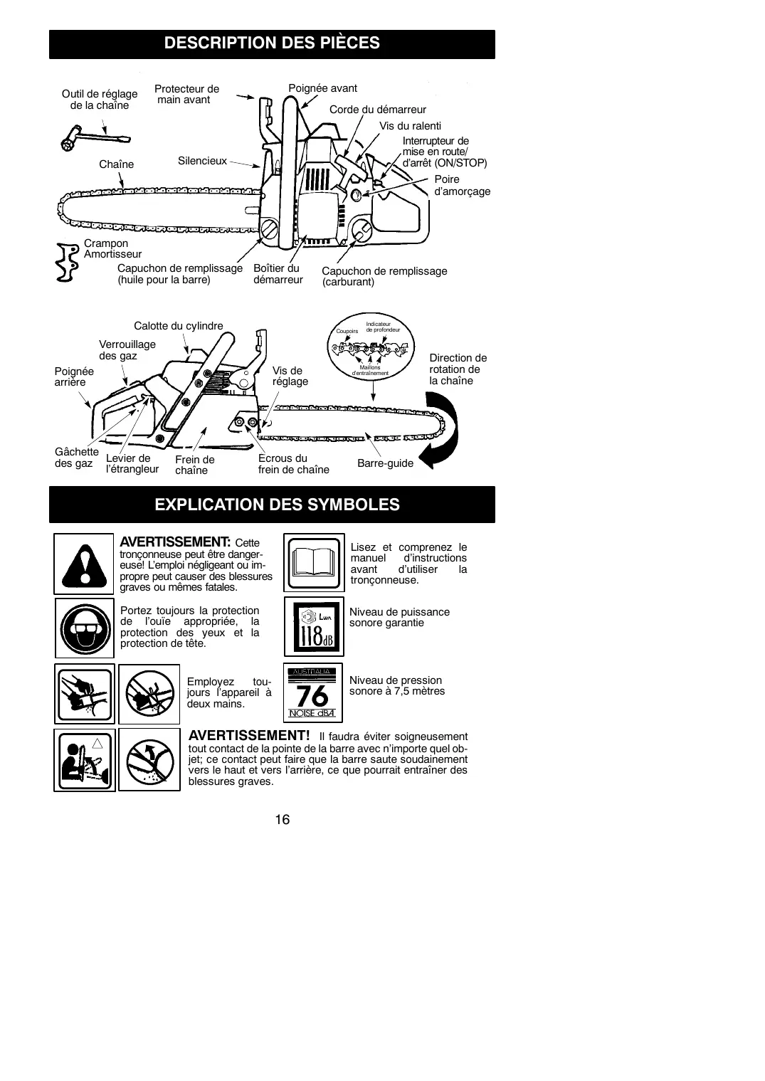 Lisez et comprenez le manuel d’instructions avant d’utiliser tronçonneuse. tronçonneuse peut être dangereuse! L’emploi négligeant ou impropre peut causer des blessures graves ou mêmes fatales. Portez toujours la protection de l’ouïe appropriée, la protection des yeux et la protection de tête. Niveau de puissance sonore garantie Niveau de pression sonore à 7,5 mètres Employez toujours l’appareil à deux mains. AVERTISSEMENT! Il faudra éviter soigneusement tout contact de la pointe de la barre avec n’importe quel objet; ce contact peut faire que la barre saute soudainement vers le haut et vers l’arrière, ce que pourrait entraîner des blessures graves.