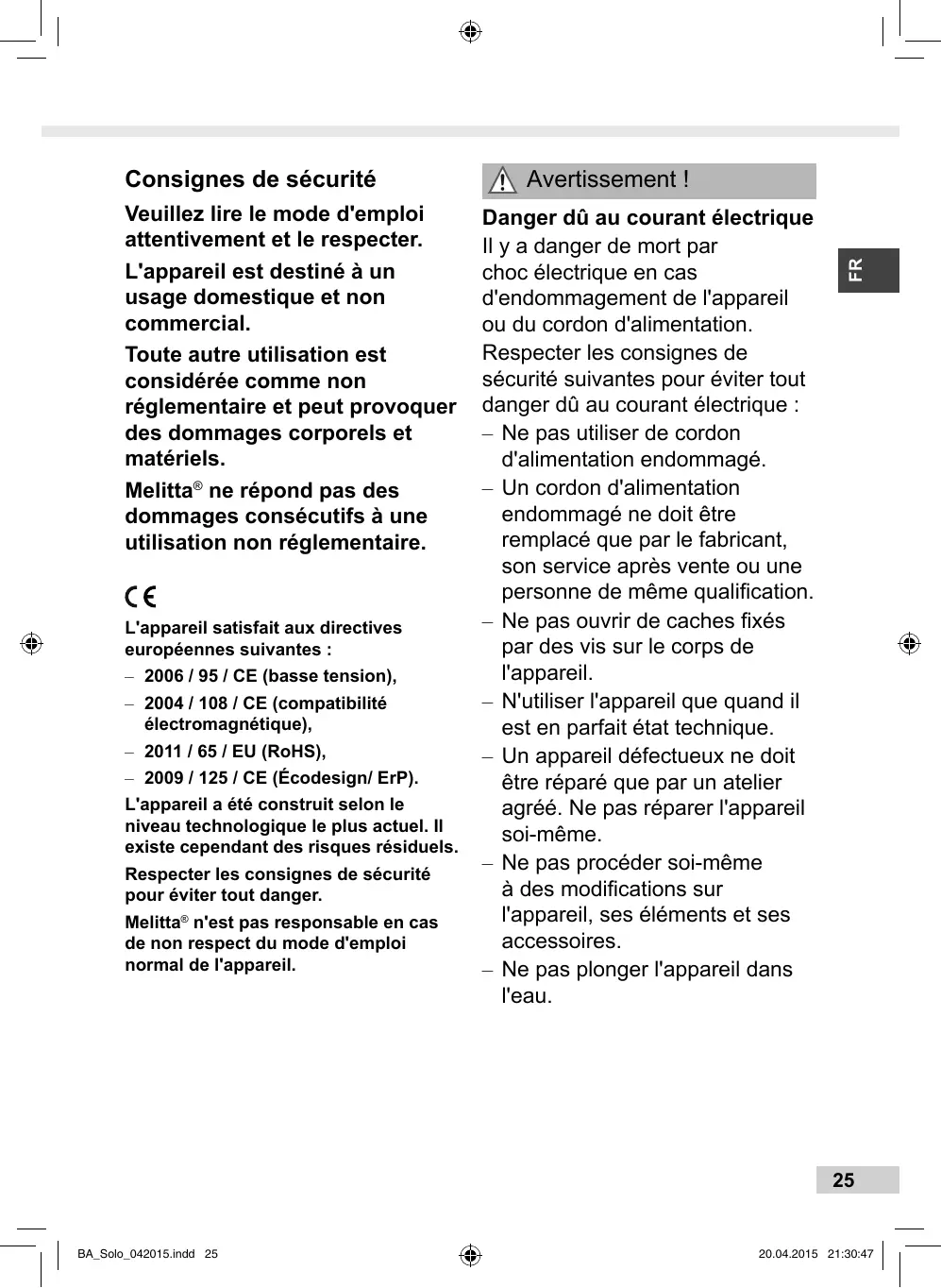 Veuillez lire le mode d'emploi attentivement et le respecter. L'appareil est destiné à un usage domestique et non commercial. Toute autre utilisation est considérée comme non réglementaire et peut provoquer des dommages corporels et matériels. Melitta® ne répond pas des dommages consécutifs à une utilisation non réglementaire. L'appareil satisfait aux directives européennes suivantes : – 2006 / 95 / CE (basse tension), – 2004 / 108 / CE (compatibilité électromagnétique), – 2011 / 65 / EU (RoHS), – 2009 / 125 / CE (Écodesign/ ErP). L'appareil a été construit selon le niveau technologique le plus actuel. Il existe cependant des risques résiduels. Respecter les consignes de sécurité pour éviter tout danger. Melitta® n'est pas responsable en cas de non respect du mode d'emploi normal de l'appareil. Avertissement ! Danger dû au courant électrique Il y a danger de mort par choc électrique en cas d'endommagement de l'appareil ou du cordon d'alimentation. Respecter les consignes de sécurité suivantes pour éviter tout danger dû au courant électrique : – Ne pas utiliser de cordon d'alimentation endommagé. – Un cordon d'alimentation endommagé ne doit être remplacé que par le fabricant, son service après vente ou une personne de même qualification. – Ne pas ouvrir de caches fixés par des vis sur le corps de l'appareil. – N'utiliser l'appareil que quand il est en parfait état technique. – Un appareil défectueux ne doit être réparé que par un atelier agréé. Ne pas réparer l'appareil soi-même. – Ne pas procéder soi-même à des modifications sur l'appareil, ses éléments et ses accessoires. – Ne pas plonger l'appareil dans l'eau.