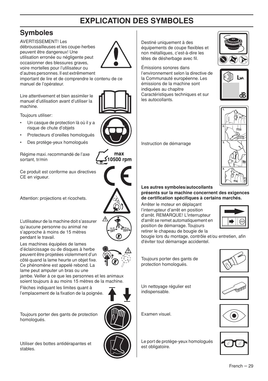 Ce produit est conforme aux directives CE en vigueur. Attention: projections et ricochets. L’utilisateur de la machine doit s’assurer qu’aucune personne ou animal ne 15 m 15 m 50FT 50FT s’approche à moins de 15 mètres pendant le travail. Les machines équipées de lames d’éclaircissage ou de disques à herbe peuvent être projetées violemment d’un côté quand la lame heurte un objet fixe. Ce phénomène est appelé rebond. La lame peut amputer un bras ou une jambe. Veiller à ce que les personnes et les animaux soient toujours à au moins 15 mètres de la machine. Flèches indiquant les limites quant à l’emplacement de la fixation de la poignée. Les autres symboles/autocollants présents sur la machine concernent des exigences de certification spécifiques à certains marchés. Arrêter le moteur en déplaçant l’interrupteur d’arrêt en position d’arrêt. REMARQUE! L'interrupteur d'arrêt se remet automatiquement en position de démarrage. Toujours retirer le chapeau de bougie de la bougie lors du montage, contrôle et/ou entretien, afin d'éviter tout démarrage accidentel. Toujours porter des gants de protection homologués. Un nettoyage régulier est indispensable. Toujours porter des gants de protection homologués. Examen visuel. Utiliser des bottes antidérapantes et stables. Le port de protège-yeux homologués est obligatoire. French – 29 SOMMAIRE Sommaire