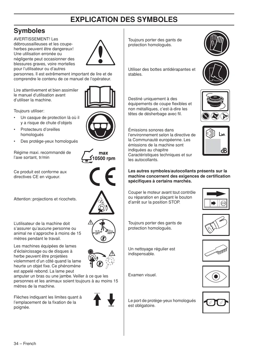 Toujours porter des gants de protection homologués. Émissions sonores dans l’environnement selon la directive de la Communauté européenne. Les émissions de la machine sont indiquées au chapitre Caractéristiques techniques et sur les autocollants. Régime maxi. recommandé de l’axe sortant, tr/min Ce produit est conforme aux directives CE en vigueur. Les autres symboles/autocollants présents sur la machine concernent des exigences de certification spécifiques à certains marchés. Attention: projections et ricochets. Couper le moteur avant tout contrôle ou réparation en plaçant le bouton d’arrêt sur la position STOP. L’utilisateur de la machine doit s’assurer qu’aucune personne ou animal ne s’approche à moins de 15 mètres pendant le travail. 15 m 50FT 15 m 50FT Les machines équipées de lames d’éclaircissage ou de disques à herbe peuvent être projetées violemment d’un côté quand la lame heurte un objet fixe. Ce phénomène est appelé rebond. La lame peut amputer un bras ou une jambe. Veiller à ce que les personnes et les animaux soient toujours à au moins 15 mètres de la machine. Flèches indiquant les limites quant à l’emplacement de la fixation de la poignée. 34 – French Toujours porter des gants de protection homologués. Un nettoyage régulier est indispensable. Examen visuel. Le port de protège-yeux homologués est obligatoire. SOMMAIRE Sommaire