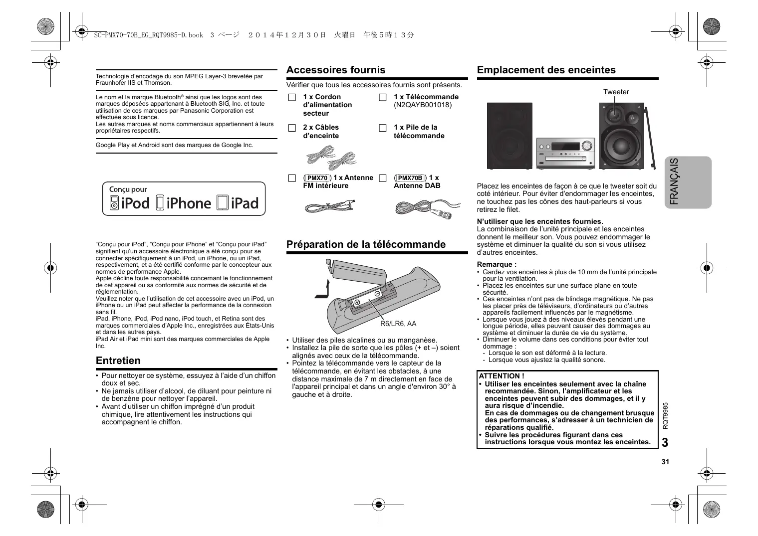- Suivre les procédures figurant dans ces instructions lorsque vous montez les enceintes. RQT9985 “Conçu pour iPod”, “Conçu pour iPhone” et “Conçu pour iPad” signifient qu’un accessoire électronique a été conçu pour se connecter spécifiquement à un iPod, un iPhone, ou un iPad, respectivement, et a été certifié conforme par le concepteur aux normes de performance Apple. Apple décline toute responsabilité concernant le fonctionnement de cet appareil ou sa conformité aux normes de sécurité et de réglementation. Veuillez noter que l’utilisation de cet accessoire avec un iPod, un iPhone ou un iPad peut affecter la performance de la connexion sans fil. iPad, iPhone, iPod, iPod nano, iPod touch, et Retina sont des marques commerciales d’Apple Inc., enregistrées aux États-Unis et dans les autres pays. iPad Air et iPad mini sont des marques commerciales de Apple Inc. ([PMX70B]) 1 x Antenne DAB FRANÇAIS Google Play et Android sont des marques de Google Inc.