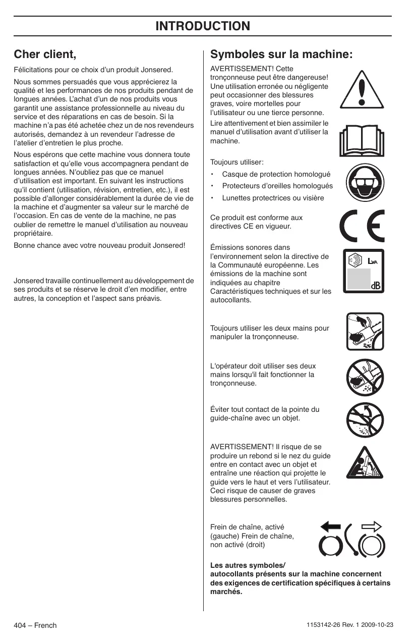 0,40 0,60 1153142-26 Rev. 1 2009-10-23 Symboles sur la machine: Félicitations pour ce choix d’un produit Jonsered. AVERTISSEMENT! Cette tronçonneuse peut être dangereuse! Une utilisation erronée ou négligente peut occasionner des blessures graves, voire mortelles pour l’utilisateur ou une tierce personne. Lire attentivement et bien assimiler le manuel d’utilisation avant d’utiliser la machine. Nous sommes persuadés que vous apprécierez la qualité et les performances de nos produits pendant de longues années. L’achat d’un de nos produits vous garantit une assistance professionnelle au niveau du service et des réparations en cas de besoin. Si la machine n’a pas été achetée chez un de nos revendeurs autorisés, demandez à un revendeur l’adresse de l’atelier d’entretien le plus proche. Nous espérons que cette machine vous donnera toute satisfaction et qu’elle vous accompagnera pendant de longues années. N’oubliez pas que ce manuel d’utilisation est important. En suivant les instructions qu’il contient (utilisation, révision, entretien, etc.), il est possible d’allonger considérablement la durée de vie de la machine et d’augmenter sa valeur sur le marché de l’occasion. En cas de vente de la machine, ne pas oublier de remettre le manuel d’utilisation au nouveau propriétaire. Bonne chance avec votre nouveau produit Jonsered! Jonsered travaille continuellement au développement de ses produits et se réserve le droit d’en modifier, entre autres, la conception et l’aspect sans préavis. Toujours utiliser: