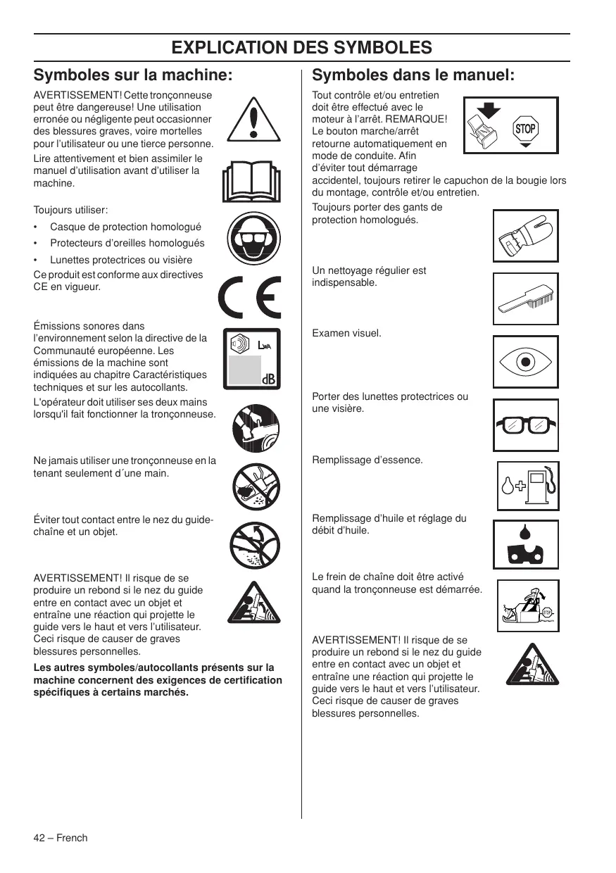 Symboles sur la machine: Symboles dans le manuel: AVERTISSEMENT! Cette tronçonneuse peut être dangereuse! Une utilisation erronée ou négligente peut occasionner des blessures graves, voire mortelles pour l’utilisateur ou une tierce personne. Lire attentivement et bien assimiler le manuel d’utilisation avant d’utiliser la machine. Tout contrôle et/ou entretien doit être effectué avec le moteur à l’arrêt. REMARQUE! Le bouton marche/arrêt retourne automatiquement en mode de conduite. Afin d’éviter tout démarrage accidentel, toujours retirer le capuchon de la bougie lors du montage, contrôle et/ou entretien. Toujours porter des gants de protection homologués. Toujours utiliser: