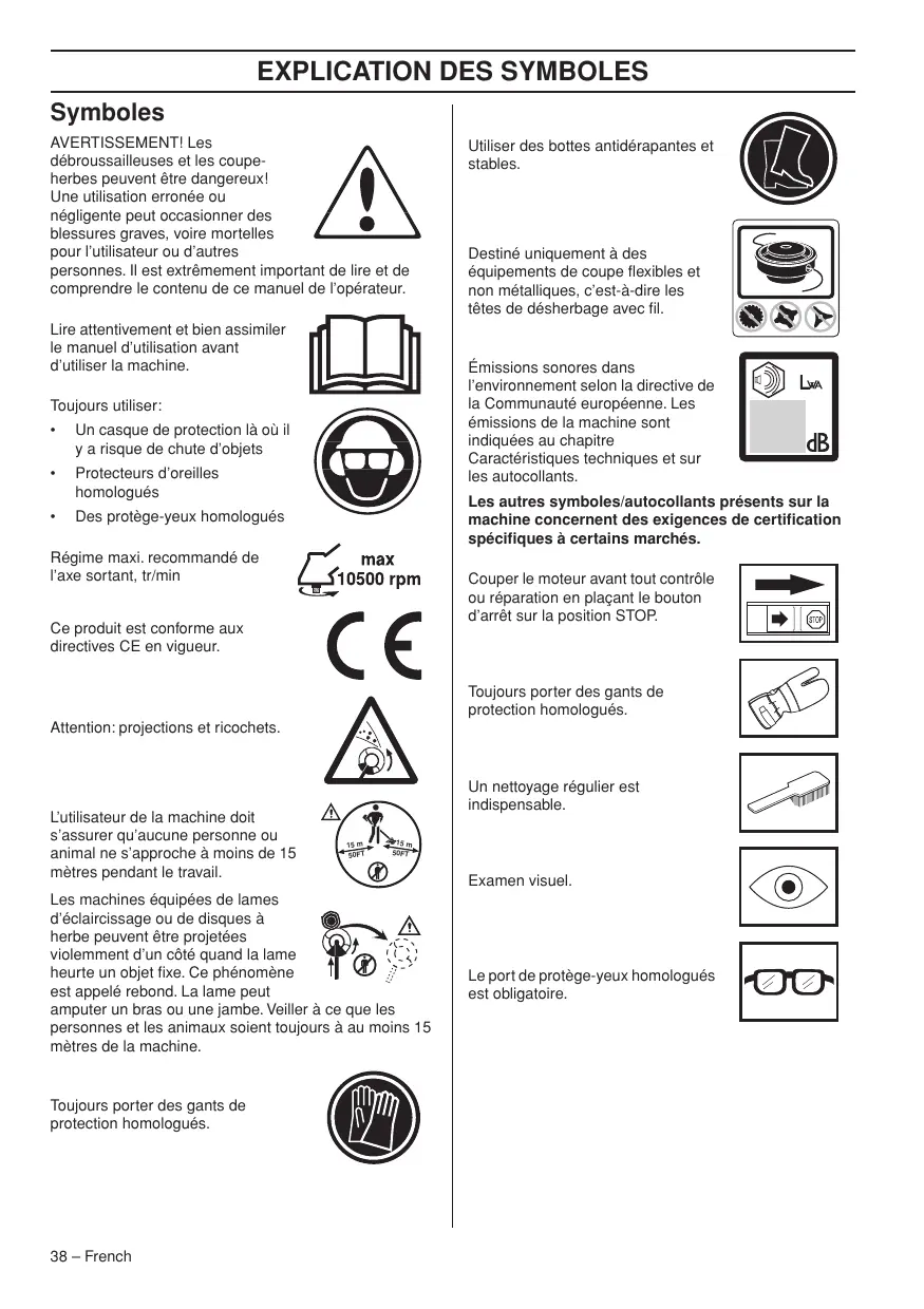 Utiliser des bottes antidérapantes et stables. Les autres symboles/autocollants présents sur la machine concernent des exigences de certification spécifiques à certains marchés. Régime maxi. recommandé de l’axe sortant, tr/min Couper le moteur avant tout contrôle ou réparation en plaçant le bouton d’arrêt sur la position STOP. Ce produit est conforme aux directives CE en vigueur. Toujours porter des gants de protection homologués. Attention: projections et ricochets. L’utilisateur de la machine doit s’assurer qu’aucune personne ou animal ne s’approche à moins de 15 mètres pendant le travail. Un nettoyage régulier est indispensable. 15 m 50FT 15 m 50FT Les machines équipées de lames d’éclaircissage ou de disques à herbe peuvent être projetées violemment d’un côté quand la lame heurte un objet fixe. Ce phénomène est appelé rebond. La lame peut amputer un bras ou une jambe. Veiller à ce que les personnes et les animaux soient toujours à au moins 15 mètres de la machine. Toujours porter des gants de protection homologués. 38 – French Examen visuel. Le port de protège-yeux homologués est obligatoire. SOMMAIRE Sommaire