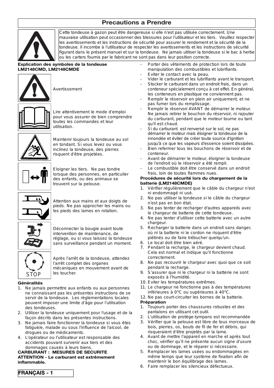 Porter des vêtements de protection lors de toute manipulation des combustibles et lubrifiants. - Eviter le contact avec la peau. - Vider le carburant et les lubrifiants avant le transport. - Stocker le carburant dans un endroit frais, dans un conteneur spécialement conçu à cet effet. En général, les conteneurs en plastique ne conviennent pas. - Remplir le réservoir en plein air uniquement, et ne pas fumer lors du remplissage. - Remplir le réservoir AVANT de démarrer le moteur. Ne jamais retirer le bouchon du réservoir, ni rajouter du carburant, pendant que le moteur tourne ou tant qu'il est chaud. - Si du carburant est renversé sur le sol, ne pas démarrer le moteur mais éloigner la tondeuse de la innondée et éviter de créer toute source d'ignition jusqu'à ce que les vapeurs d'essence soient dissipées. - Bien refermer tous les bouchons de réservoir et de conteneur. - Avant de démarrer le moteur, éloigner la tondeuse de l’endroit où le réservoir a été rempli. - Le combustible doit être conservé dans un endroit frais, loin de toutes flammes nues. Procédures de sécurité lors du chargement de la batterie (LM2148CMDE)