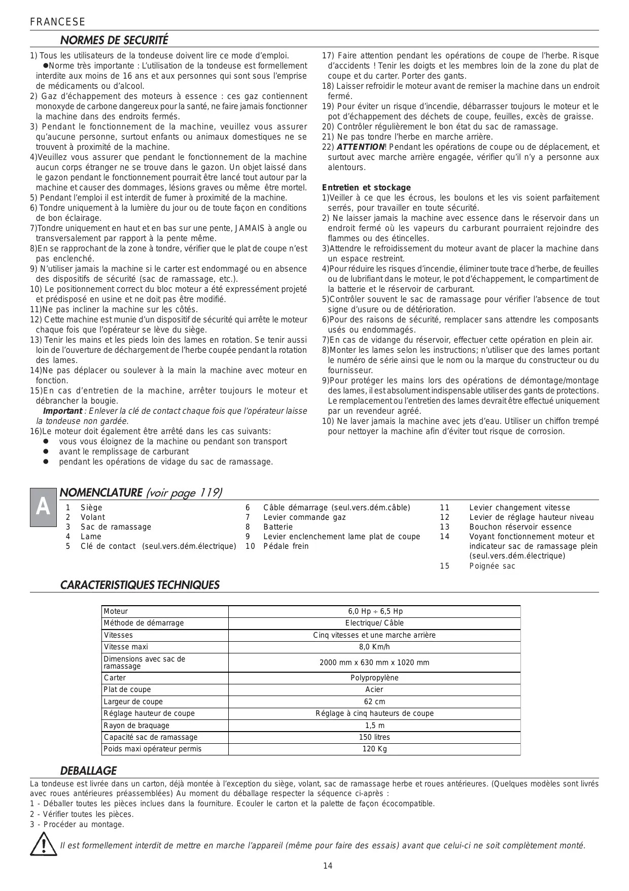 1) Tous les utilisateurs de la tondeuse doivent lire ce mode d’emploi. lNorme très importante : L’utilisation de la tondeuse est formellement interdite aux moins de 16 ans et aux personnes qui sont sous l’emprise de médicaments ou d’alcool. 2) Gaz d’échappement des moteurs à essence : ces gaz contiennent monoxyde de carbone dangereux pour la santé, ne faire jamais fonctionner la machine dans des endroits fermés. 3) Pendant le fonctionnement de la machine, veuillez vous assurer qu’aucune personne, surtout enfants ou animaux domestiques ne se trouvent à proximité de la machine. 4)Veuillez vous assurer que pendant le fonctionnement de la machine aucun corps étranger ne se trouve dans le gazon. Un objet laissé dans le gazon pendant le fonctionnement pourrait être lancé tout autour par la machine et causer des dommages, lésions graves ou même être mortel. 5) Pendant l’emploi il est interdit de fumer à proximité de la machine. 6) Tondre uniquement à la lumière du jour ou de toute façon en conditions de bon éclairage. 7)Tondre uniquement en haut et en bas sur une pente, JAMAIS à angle ou transversalement par rapport à la pente même. 8)En se rapprochant de la zone à tondre, vérifier que le plat de coupe n’est pas enclenché. 9) N’utiliser jamais la machine si le carter est endommagé ou en absence des dispositifs de sécurité (sac de ramassage, etc.). 10) Le positionnement correct du bloc moteur a été expressément projeté et prédisposé en usine et ne doit pas être modifié. 11)Ne pas incliner la machine sur les côtés. 12) Cette machine est munie d’un dispositif de sécurité qui arrête le moteur chaque fois que l’opérateur se lève du siège. 13) Tenir les mains et les pieds loin des lames en rotation. Se tenir aussi loin de l’ouverture de déchargement de l’herbe coupée pendant la rotation des lames. 14)Ne pas déplacer ou soulever à la main la machine avec moteur en fonction. 15)En cas d’entretien de la machine, arrêter toujours le moteur et débrancher la bougie. Important : Enlever la clé de contact chaque fois que l’opérateur laisse la tondeuse non gardée. 16)Le moteur doit également être arrêté dans les cas suivants: l vous vous éloignez de la machine ou pendant son transport l avant le remplissage de carburant l pendant les opérations de vidage du sac de ramassage.