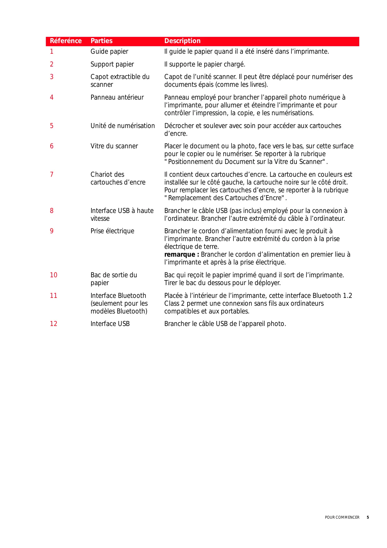 | 6 | Vitre du scanner | Placer le document ou la photo, face vers le bas, sur cette surface pour le copier ou le numérique. Se reporter à la rubrique "Positionnement du Document sur la Vitre du Scanner". |