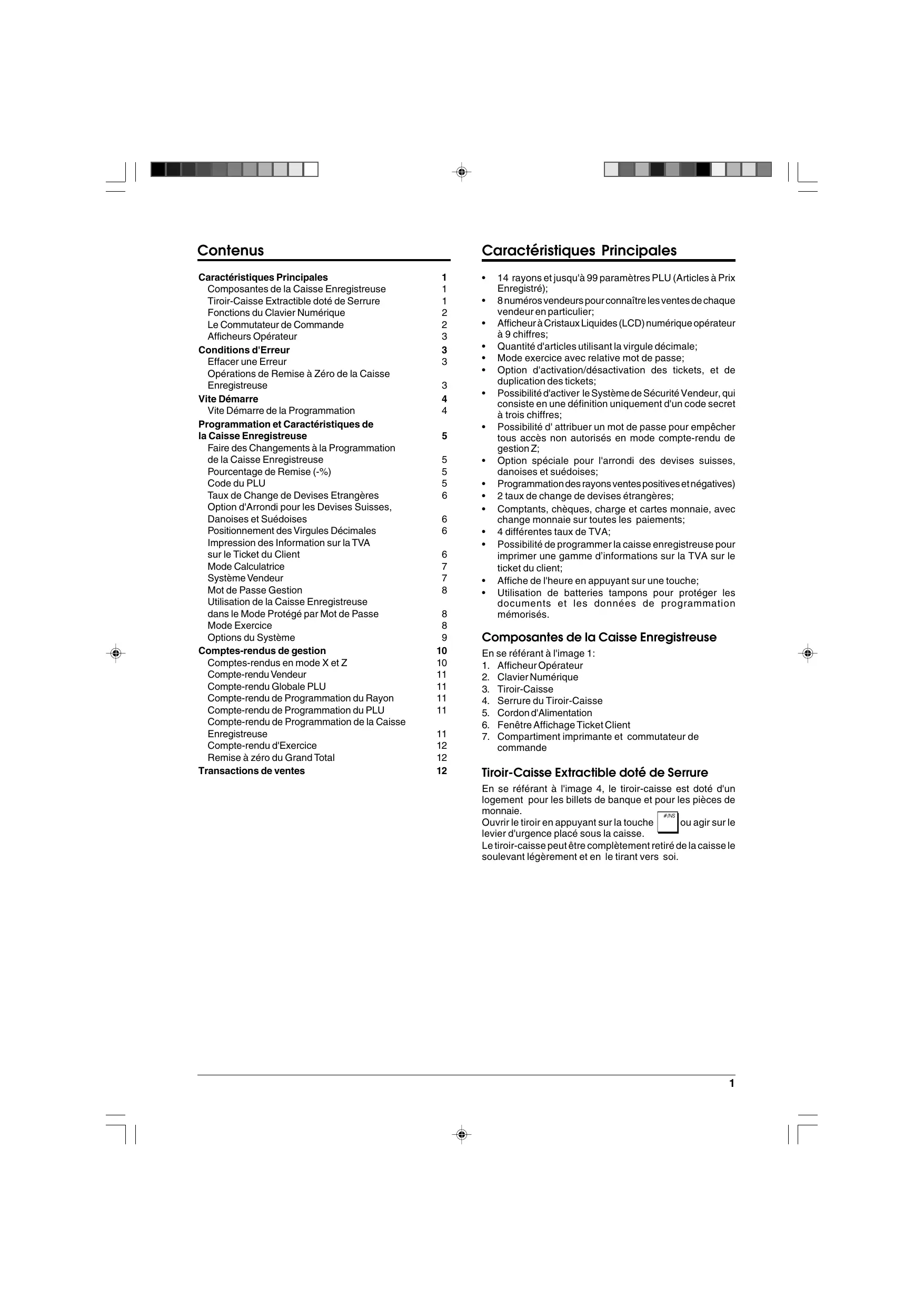 FRANÇAIS Caractéristiques Principales Composantes de la Caisse Enregistreuse Tiroir-Caisse Extractible doté de Serrure Fonctions du Clavier Numérique Le Commutateur de Commande Afficheurs Opérateur Conditions d'Erreur Effacer une Erreur Opérations de Remise à Zéro de la Caisse Enregistreuse Vite Démarre Vite Démarre de la Programmation Programmation et Caractéristiques de la Caisse Enregistreuse Faire des Changements à la Programmation de la Caisse Enregistreuse Pourcentage de Remise (-%) Code du PLU Taux de Change de Devises Etrangères Option d'Arrondi pour les Devises Suisses, Danoises et Suédoises Positionnement des Virgules Décimales Impression des Information sur la TVA sur le Ticket du Client Mode Calculatrice Système Vendeur Mot de Passe Gestion Utilisation de la Caisse Enregistreuse dans le Mode Protégé par Mot de Passe Mode Exercice Options du Système Comptes-rendus de gestion Comptes-rendus en mode X et Z Compte-rendu Vendeur Compte-rendu Globale PLU Compte-rendu de Programmation du Rayon Compte-rendu de Programmation du PLU Compte-rendu de Programmation de la Caisse Enregistreuse Compte-rendu d'Exercice Remise à zéro du Grand Total Transactions de ventes Caractéristiques Principales Fonctions du Clavier Numérique