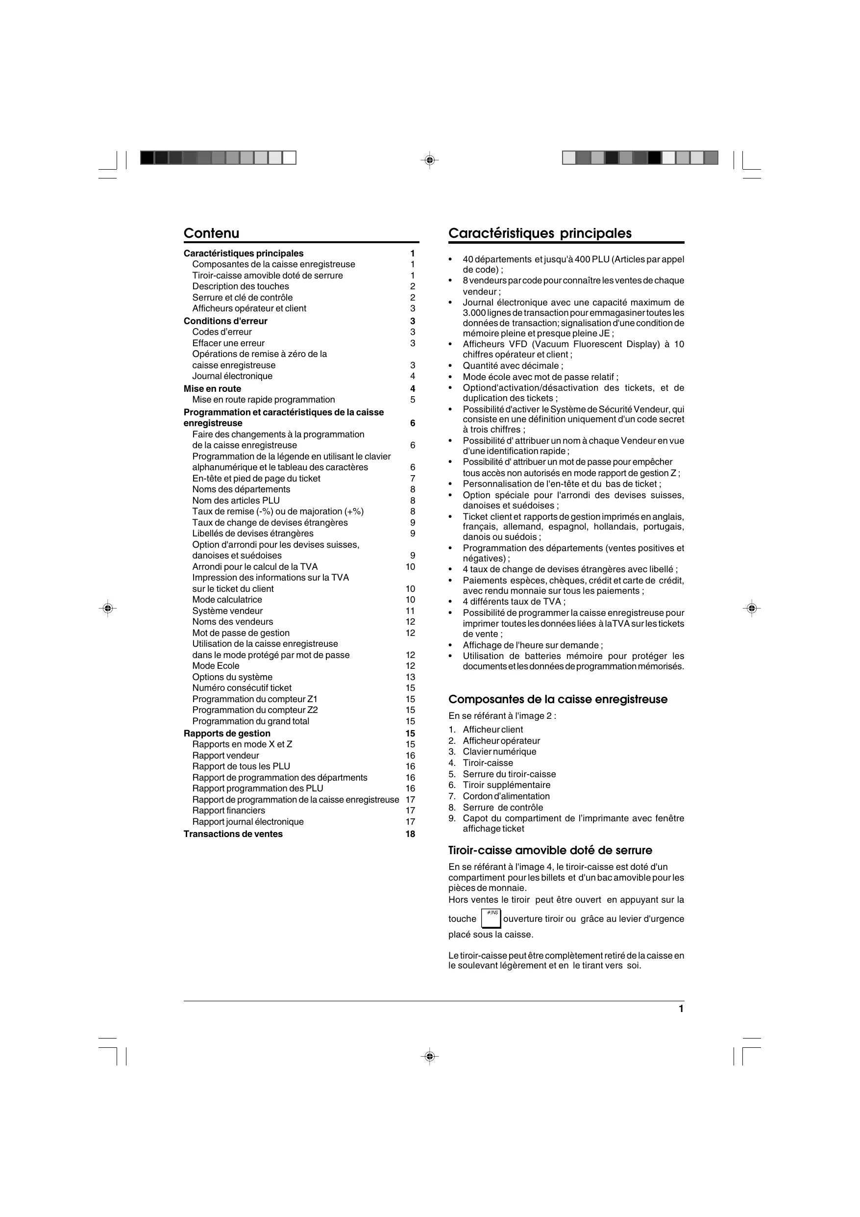 DAGLIGE ARBEJDSOPERATIONER DAGLIGA ARBETSMOMENT Morning startup Démarre du matin Einschalten zu Geschäftsbeginn Puesta en marcha al inicio de la jornada Morgens opstarten Arranque da manhã Morgens opstart Sales transactions Transactions de ventes Verkaufsvorgänge Transacciones de venta Verkooptransacties Transacções de vendas Salgstransaktioner Igångsättning på morgonen End of day reports Compte-rendu de fin journée Berichte bei Geschäftsende Informes de cierre de la jornada Einddaags-rapportages Relatórios de fim de dia Slut af dagens registreringer Försäljingstransaktioner Slut på dagen rapporter Contenu Caractéristiques principales Composantes de la caisse enregistreuse Tiroir-caisse amovible doté de serrure Description des touches Serrure et clé de contrôle Afficheurs opérateur et client Conditions d'erreur Codes d’erreur Effacer une erreur Opérations de remise à zéro de la caisse enregistreuse Journal électronique Mise en route Mise en route rapide programmation Programmation et caractéristiques de la caisse enregistreuse Faire des changements à la programmation de la caisse enregistreuse Programmation de la légende en utilisant le clavier alphanumérique et le tableau des caractères En-tête et pied de page du ticket Noms des départements Nom des articles PLU Taux de remise (-%) ou de majoration (+%) Taux de change de devises étrangères Libellés de devises étrangères Option d'arrondi pour les devises suisses, danoises et suédoises Arrondi pour le calcul de la TVA Impression des informations sur la TVA sur le ticket du client Mode calculatrice Système vendeur Noms des vendeurs Mot de passe de gestion Utilisation de la caisse enregistreuse dans le mode protégé par mot de passe Mode Ecole Options du système Numéro consécutif ticket Programmation du compteur Z1 Programmation du compteur Z2 Programmation du grand total Rapports de gestion Rapports en mode X et Z Rapport vendeur Rapport de tous les PLU Rapport de programmation des départments Rapport programmation des PLU Rapport de programmation de la caisse enregistreuse Rapport financiers Rapport journal électronique Transactions de ventes Caractéristiques principales