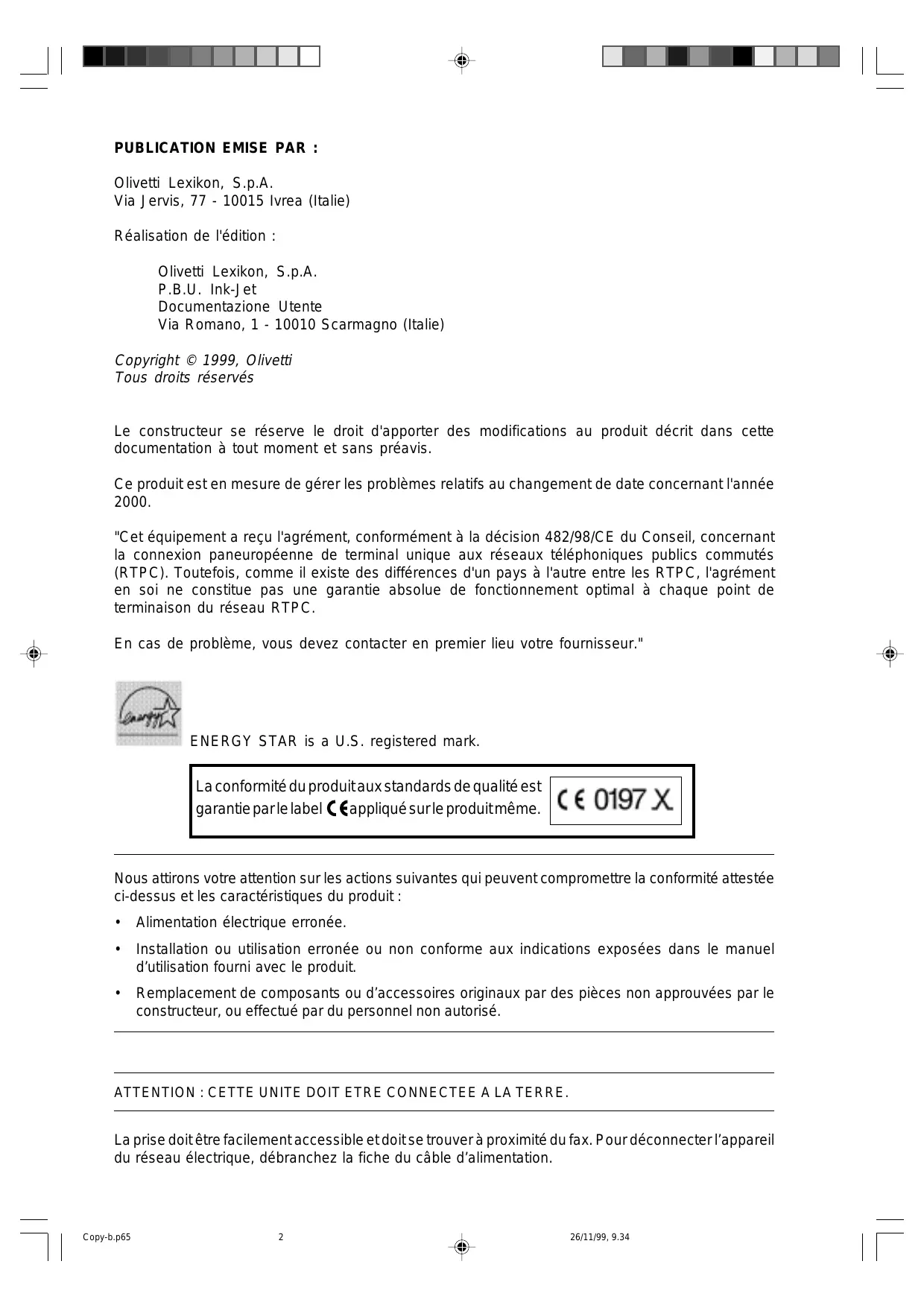 Ce télécopieur est un produit de haute qualite et respecte toutes les reglementations prevues par les directives (C. Pour garantir son correct fonctionnement, suivez les quelques recommendations indiquees ci-dessous.