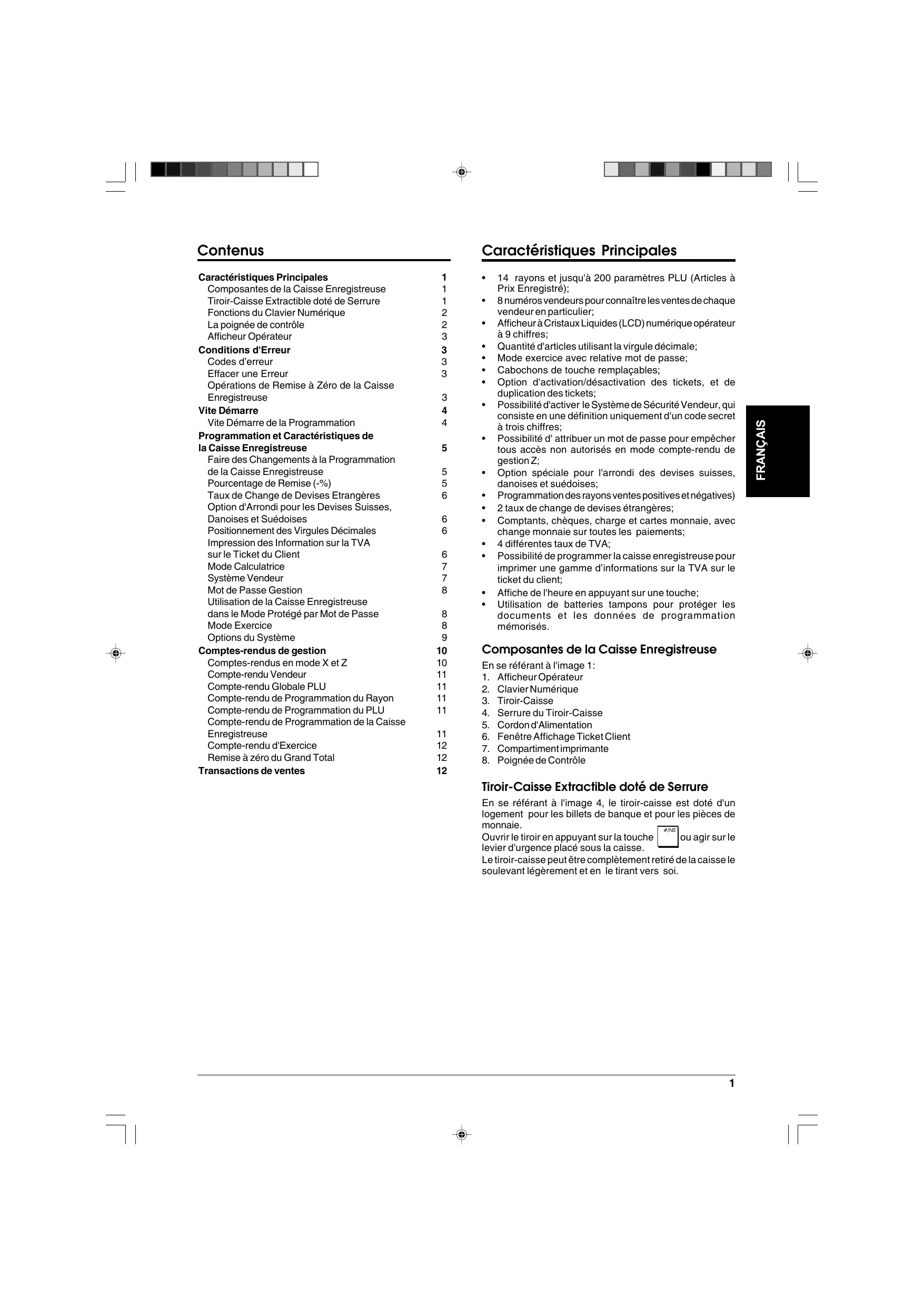 FRANÇAIS Caractéristiques Principales Composantes de la Caisse Enregistreuse Tiroir-Caisse Extractible doté de Serrure Fonctions du Clavier Numérique La poignée de contrôle Afficheur Opérateur Conditions d'Erreur Codes d’erreur Effacer une Erreur Opérations de Remise à Zéro de la Caisse Enregistreuse Vite Démarre Vite Démarre de la Programmation Programmation et Caractéristiques de la Caisse Enregistreuse Faire des Changements à la Programmation de la Caisse Enregistreuse Pourcentage de Remise (-%) Taux de Change de Devises Etrangères Option d'Arrondi pour les Devises Suisses, Danoises et Suédoises Positionnement des Virgules Décimales Impression des Information sur la TVA sur le Ticket du Client Mode Calculatrice Système Vendeur Mot de Passe Gestion Utilisation de la Caisse Enregistreuse dans le Mode Protégé par Mot de Passe Mode Exercice Options du Système Comptes-rendus de gestion Comptes-rendus en mode X et Z Compte-rendu Vendeur Compte-rendu Globale PLU Compte-rendu de Programmation du Rayon Compte-rendu de Programmation du PLU Compte-rendu de Programmation de la Caisse Enregistreuse Compte-rendu d'Exercice Remise à zéro du Grand Total Transactions de ventes Caractéristiques Principales Fonctions du Clavier Numérique