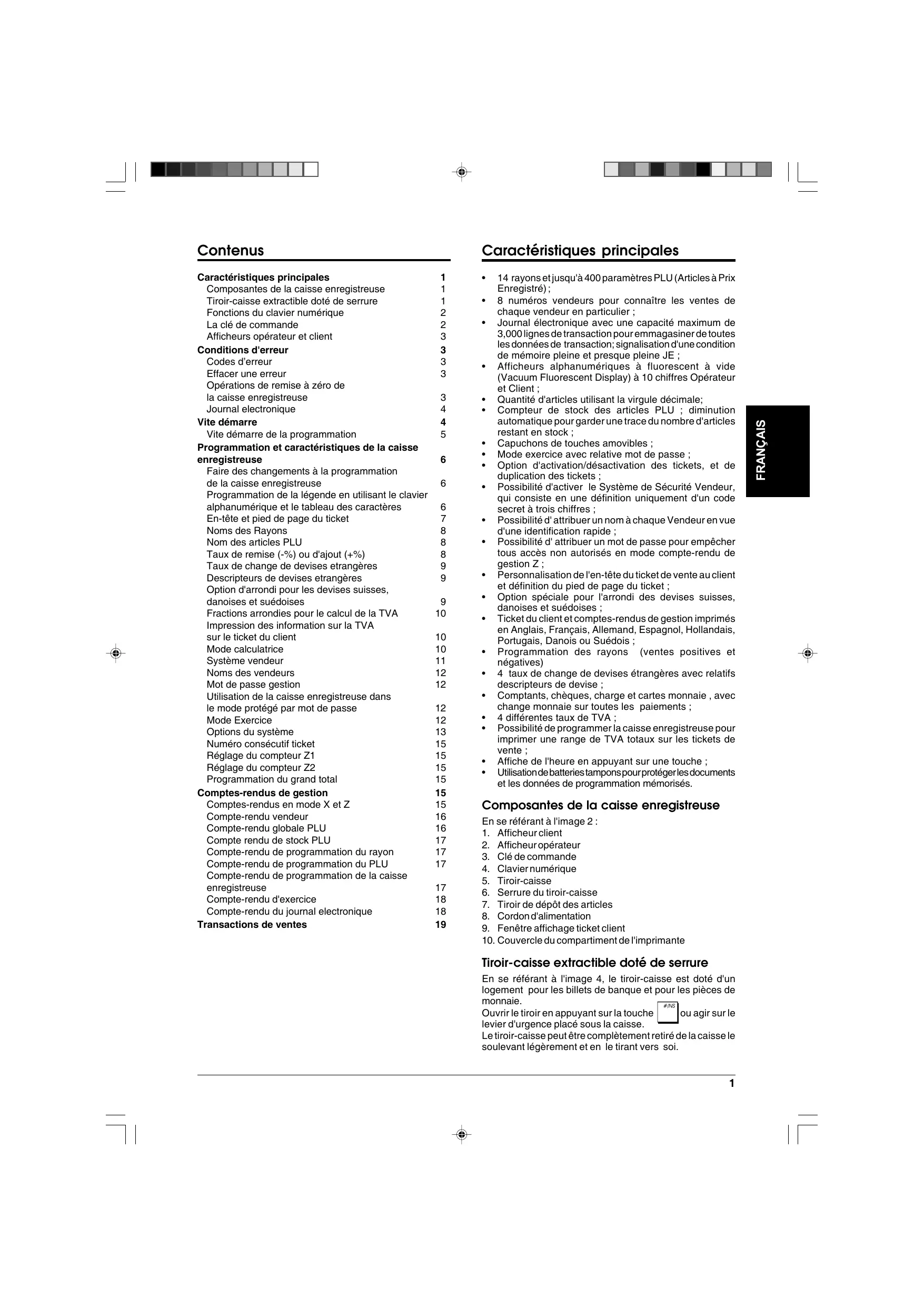 Afficheurs opérateur et client Conditions d'erreur Codes d’erreur Effacer une erreur Opérations de remise à zéro de la caisse enregistreuse Journal electronique Vite démarre Vite démarre de la programmation Programmation et caractéristiques de la caisse enregistreuse Faire des changements à la programmation de la caisse enregistreuse Programmation de la légende en utilisant le clavier alphanumérique et le tableau des caractères En-tête et pied de page du ticket Noms des Rayons Nom des articles PLU Taux de remise (-%) ou d'ajout (+%) Taux de change de devises etrangères Descripteurs de devises etrangères Option d'arrondi pour les devises suisses, danoises et suédoises Fractions arrondies pour le calcul de la TVA Impression des information sur la TVA sur le ticket du client Mode calculatrice Système vendeur Noms des vendeurs Mot de passe gestion Utilisation de la caisse enregistreuse dans le mode protégé par mot de passe Mode Exercice Options du système Numéro consécutif ticket Réglage du compteur Z1 Réglage du compteur Z2 Programmation du grand total Comptes-rendus de gestion Comptes-rendus en mode X et Z Compte-rendu vendeur Compte-rendu globale PLU Compte rendu de stock PLU Compte-rendu de programmation du rayon Compte-rendu de programmation du PLU Compte-rendu de programmation de la caisse enregistreuse Compte-rendu d'exercice Compte-rendu du journal electronique Transactions de ventes