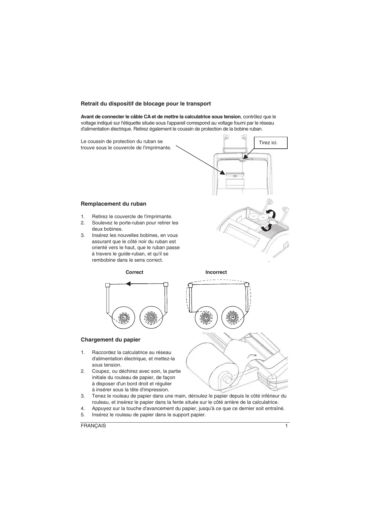 Avant de connecter le cable CA et demettre la calculatrice sous tension, contrôlez que le voltage indiqué sur l'étiquette située sous l'appareil correspond au voltage foumi par le réseau d'alimentation électrique. Retirez également le coussin de protection de la bobine ruban.