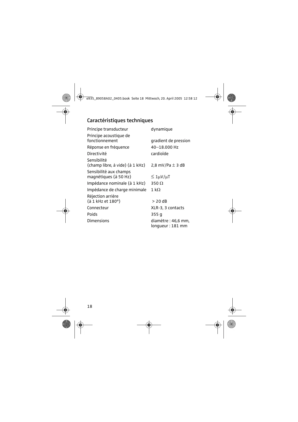 Caractéristiques techniques Principe transducteur Principe acoustique de fonctionnement Réponse en fréquence Directivité Sensibilité (champ libre, à vide) (à 1 kHz) Sensibilité aux champs magnétiques (à 50 Hz) Impédance nominale (à 1 kHz) Impédance de charge minimale Réjection arrière (à 1 kHz et 180°) Connecteur Poids Dimensions