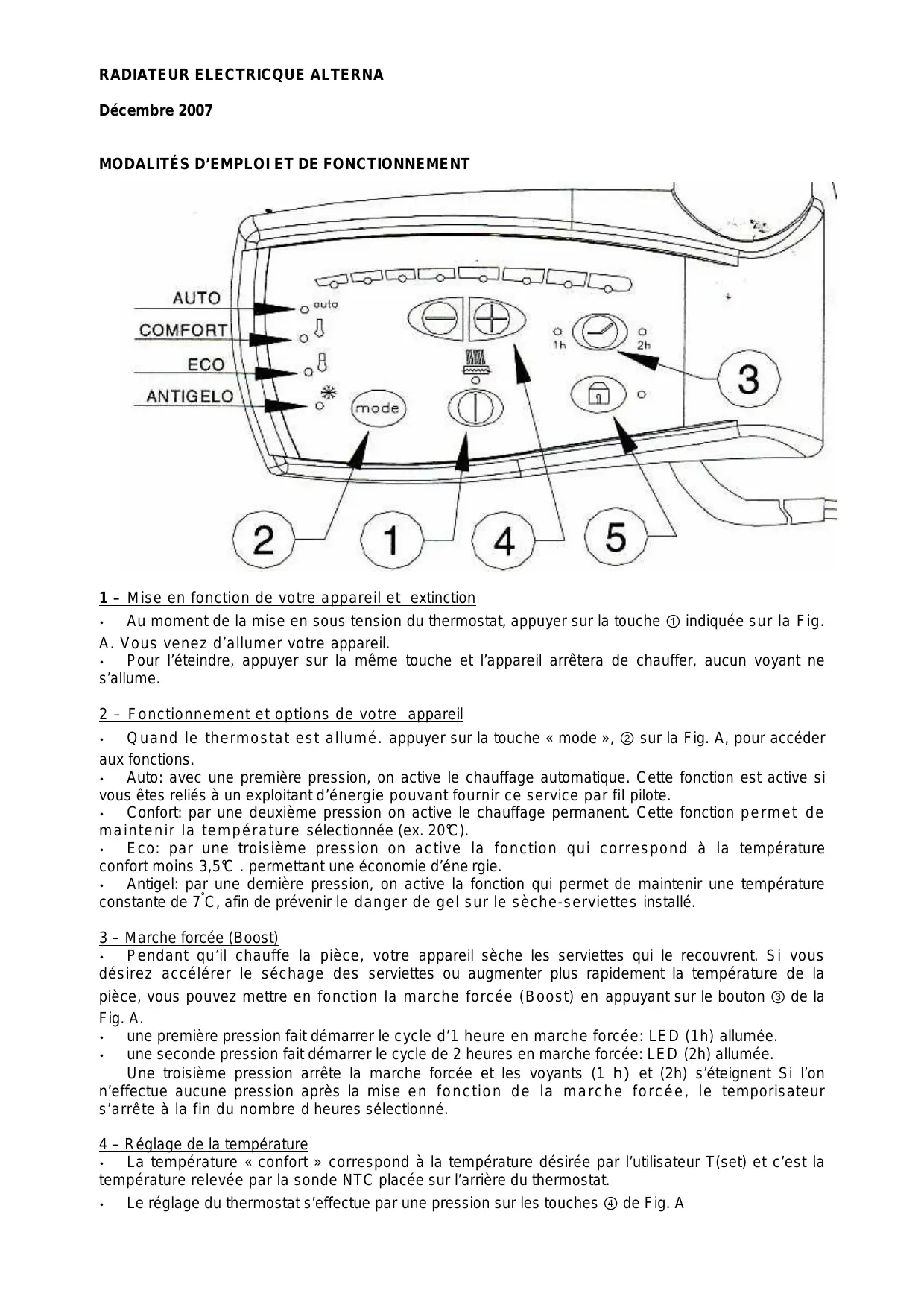 Décembre 2007 MODALITÉS D’EMPLOI ET DE FONCTIONNEMENT 1 – Mise en fonction de votre appareil et extinction Au moment de la mise en sous tension du thermostat, appuyer sur la touche ① indiquée sur la Fig. A. Vous venez d’allumer votre appareil. Pour l’éteindre, appuyer sur la même touche et l’appareil arrêtera de chauffer, aucun voyant ne s’allume.
