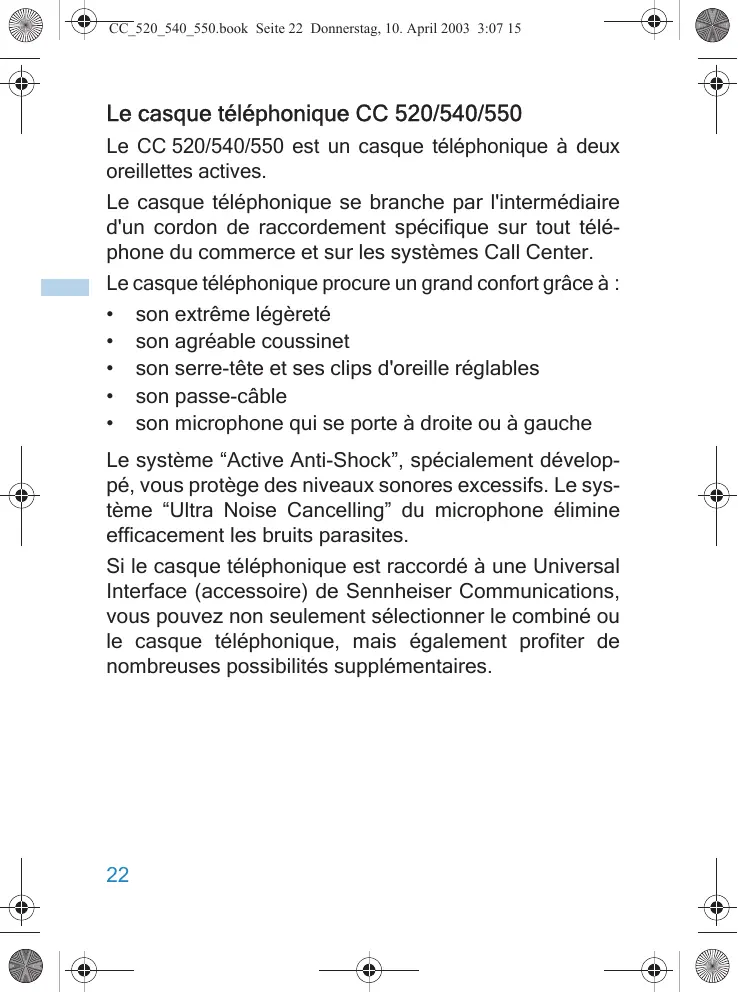 Le CC 520/540/550 est un casque téléphonique à deux oreillettes actives.