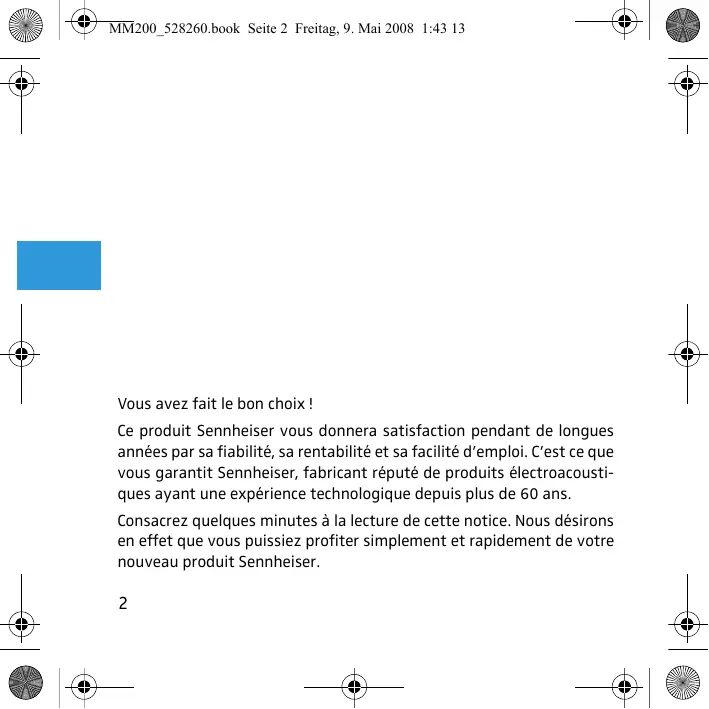 MM200_528260.book Seite 2 Freitag, 9. Mai 2008 1:43 13 Vous avez fait le bon choix ! Ce produit Sennheiser vous donnera satisfaction pendant de longues années par sa fiabilité, sa rentabilité et sa facilité d’emploi. C’est ce que vous garantit Sennheiser, fabricant réputé de produits électroacoustiques ayant une expérience technologique depuis plus de 60 ans. Consacrez quelques minutes à la lecture de cette notice. Nous désirons en effet que vous puissiez profiter simplement et rapidement de votre nouveau produit Sennheiser.