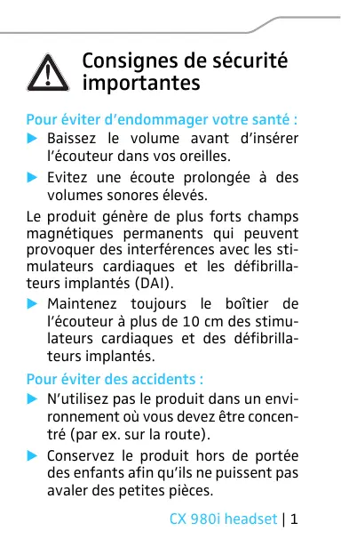 - Mousse mémoire de forme tenue confortable et sûre, réponse percutante dans les graves 왘 Sélectionnez les adaptateurs d’oreille de taille correcte et possédant les caractéristiques souhaitées. 왘 Montez les adaptateurs d’oreille sur l’écouteur. 4 | CX 980i headset Insérer l’écouteur dans les oreilles AVERTISSEMENT Interférences dues aux champs magnétiques ! Le produit génère de plus forts champs magnétiques permanents qui peuvent provoquer des interférences avec les stimulateurs cardiaques et les défibrillateurs implantés (DAI). 왘 Maintenez toujours le boîtier de l’écouteur à plus de 10 cm des stimulateurs cardiaques et des défibrillateurs implantés. CX 980i headset | 5 S/M/L