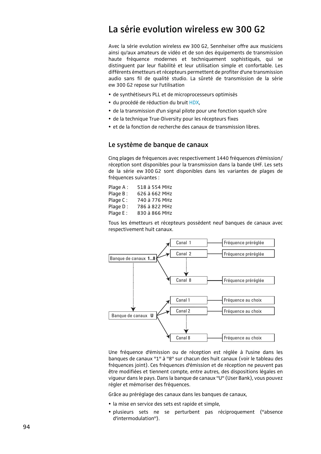 La série evolution wireless ew 300 G2 Avec la série evolution wireless ew 300 G2, Sennheiser offre aux musiciens ainsi qu'aux amateurs de vidéo et de son des équipements de transmission haute fréquence modernes et techniquement sophistiqués, qui se distinguent par leur fiabilité et leur utilisation simple et confortable. Les différents émetteurs et récepteurs permettent de profiter d'une transmission audio sans fil de qualité studio. La sûreté de transmission de la série ew 300 G2 repose sur l'utilisation y de synthétiseurs PLL et de microprocesseurs optimisés y du procédé de réduction du bruit HDX, y de la transmission d'un signal pilote pour une fonction squelch sûre y de la technique True-Diversity pour les récepteurs fixes y et de la fonction de recherche des canaux de transmission libres. Le système de banque de canaux Cinq plages de fréquences avec respectivement 1440 fréquences d'émission/ réception sont disponibles pour la transmission dans la bande UHF. Les sets de la série ew 300 G2 sont disponibles dans les variantes de plages de fréquences suivantes : Plage A : Plage B : Plage C : Plage D : Plage E : 518 à 554 MHz 626 à 662 MHz 740 à 776 MHz 786 à 822 MHz 830 à 866 MHz Tous les émetteurs et récepteurs possèdent neuf banques de canaux avec respectivement huit canaux. Canal 1 Fréquence préréglée Canal 2 Fréquence préréglée Canal 8 Fréquence préréglée Canal 1 Fréquence au choix Canal 2 Fréquence au choix Canal 8 Fréquence au choix Banque de canaux 1...8 Banque de canaux U Une fréquence d'émission ou de réception est réglée à l'usine dans les banques de canaux "1" à "8" sur chacun des huit canaux (voir le tableau des fréquences joint). Ces fréquences d'émission et de réception ne peuvent pas être modifiées et tiennent compte, entre autres, des dispositions légales en vigueur dans le pays. Dans la banque de canaux "U" (User Bank), vous pouvez régler et mémoriser des fréquences. Grâce au préréglage des canaux dans les banques de canaux, y la mise en service des sets est rapide et simple, y plusieurs sets ne se perturbent pas réciproquement ("absence d'intermodulation").