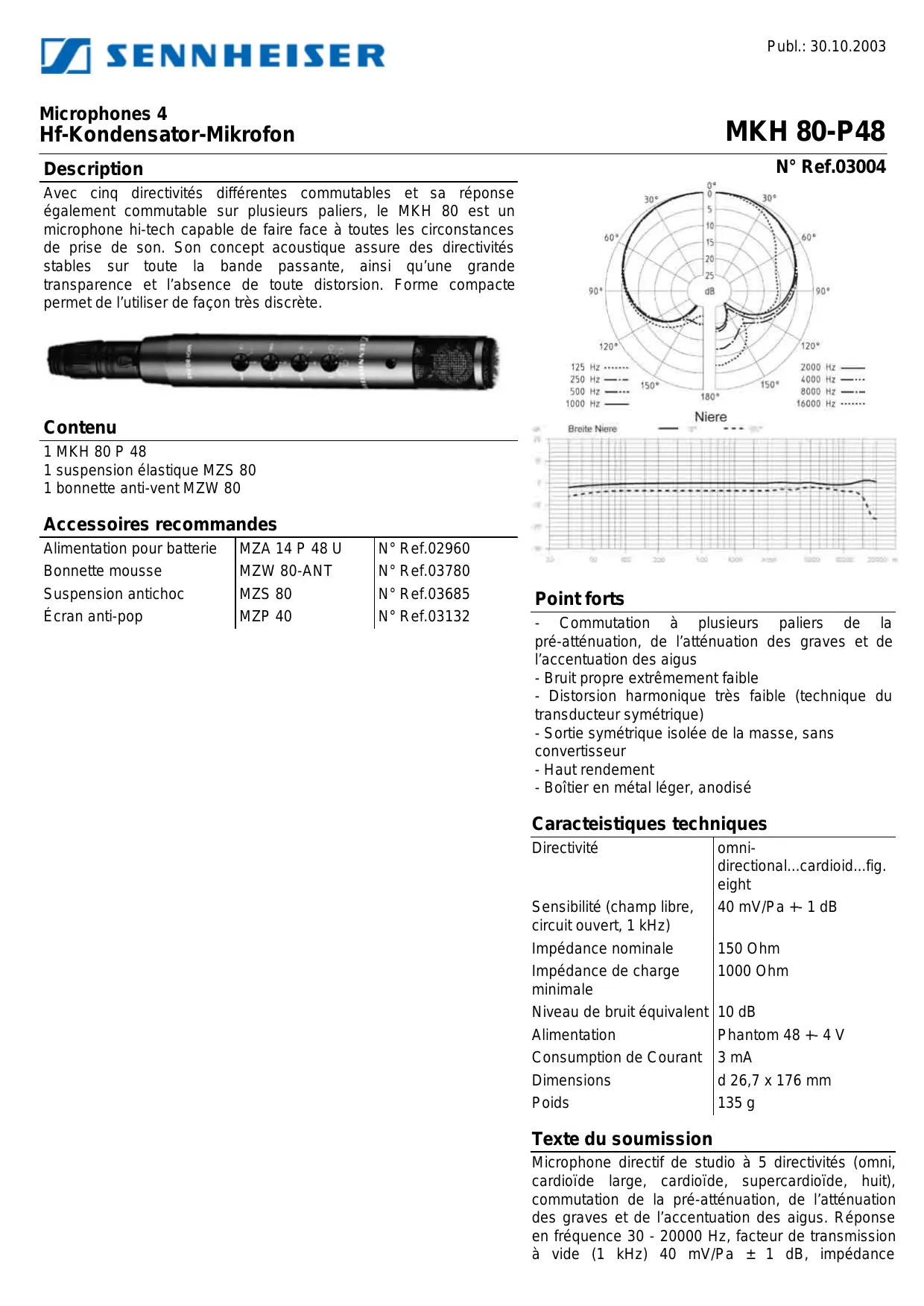Retrouvez gratuitement la notice de l'appareil MKH 80-P48 SENNHEISER au format PDF.
