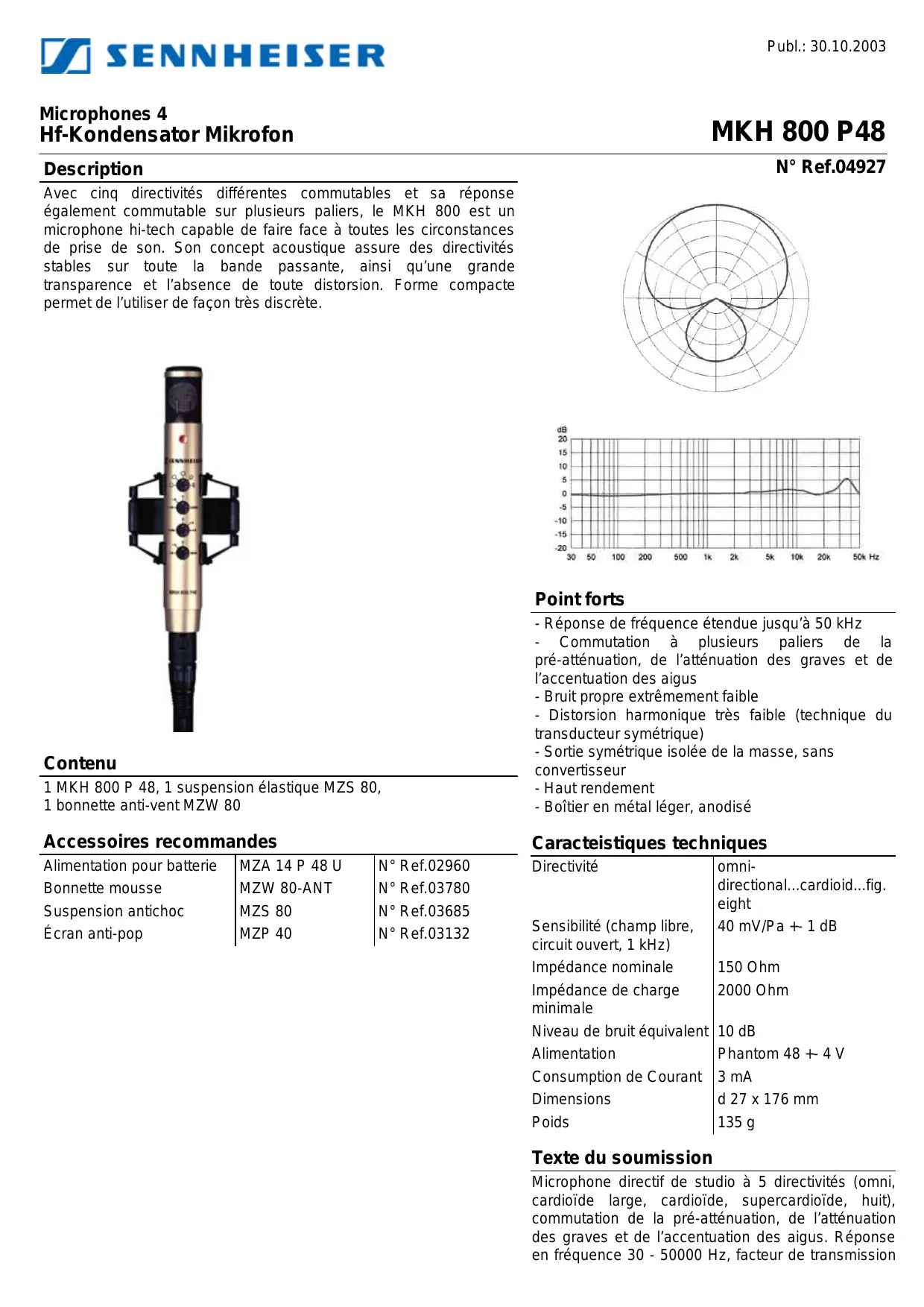 Retrouvez gratuitement la notice de l'appareil MKH 800 P48 SENNHEISER au format PDF.