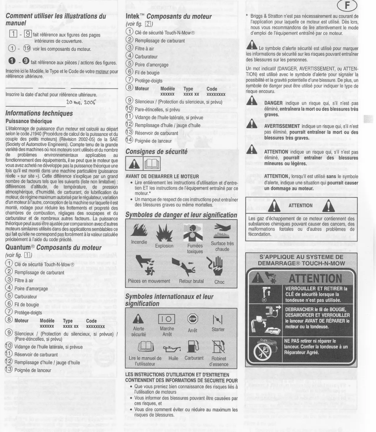 référence aux figures des pages intérieures de couverture. O @ O - O fait référence aux pièces / actions des tigures. voir les composants du moteur. Inscrire ici le Modèle, le Type et le Code de votre moteur pour référence ultérieure. Intek" (voir fig.