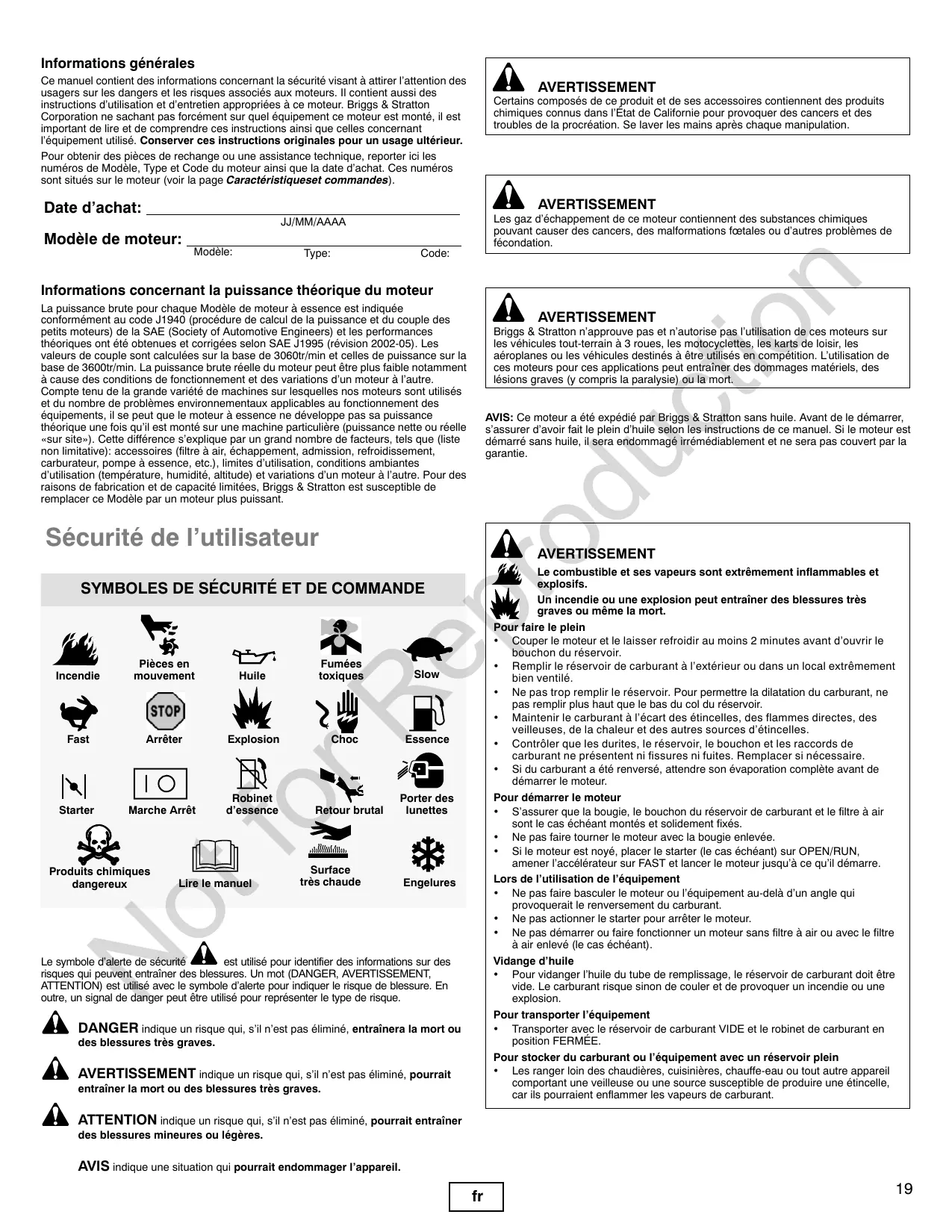 Informations générales Ce manuel contient des informations concernant la sécurité visant à attirer l’attention des usagers sur les dangers et les risques associés aux moteurs. Il contient aussi des instructions d’utilisation et d’entretien appropriées à ce moteur. Briggs & Stratton Corporation ne sachant pas forcément sur quel équipement ce moteur est monté, il est important de lire et de comprendre ces instructions ainsi que celles concernant l’équipement utilisé. Conserver ces instructions originales pour un usage ultérieur. Pour obtenir des pièces de rechange ou une assistance technique, reporter ici les numéros de Modèle, Type et Code du moteur ainsi que la date d’achat. Ces numéros sont situés sur le moteur (voir la page Caractéristiqueset commandes). AVERTISSEMENT Certains composés de ce produit et de ses accessoires contiennent des produits chimiques connus dans l’État de Californie pour provoquer des cancers et des troubles de la procréation. Se laver les mains après chaque manipulation. AVERTISSEMENT Les gaz d’échappement de ce moteur contiennent des substances chimiques pouvant causer des cancers, des malformations fœtales ou d’autres problèmes de fécondation.