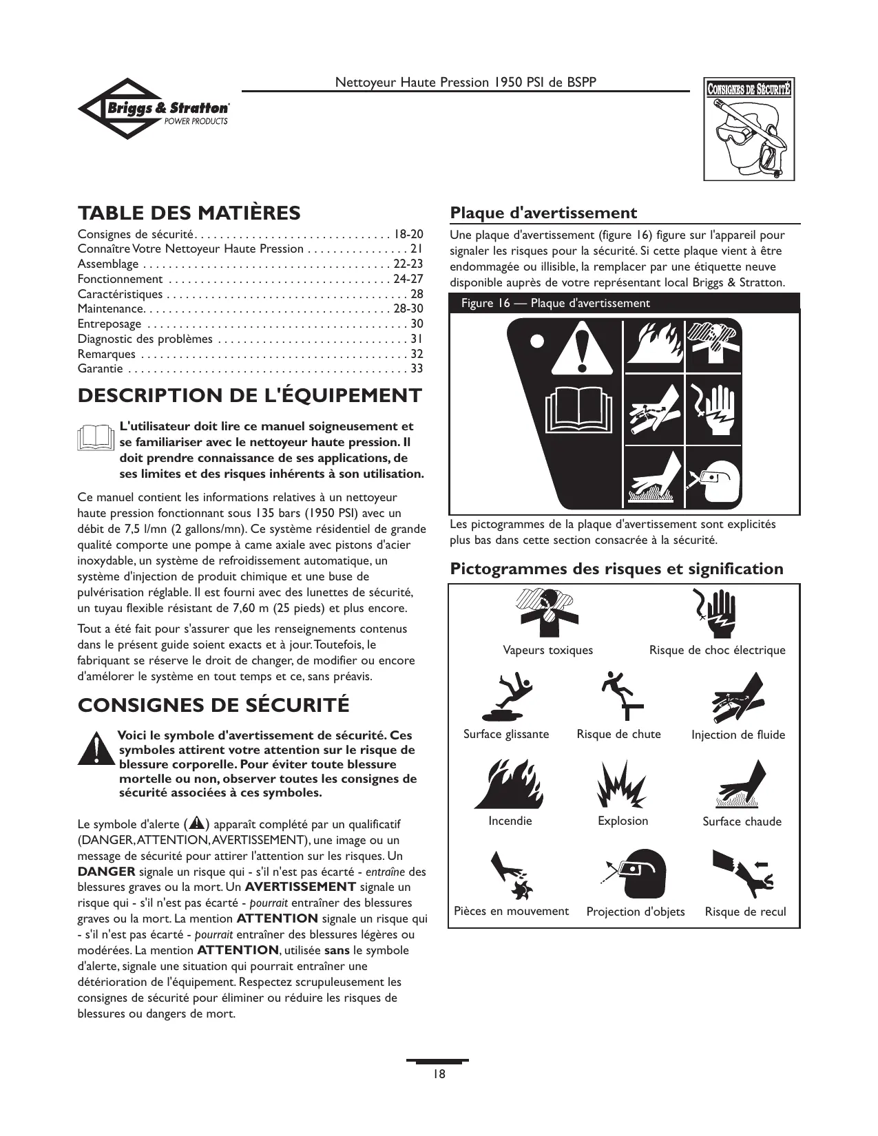 - Garantie Une plaque d'avertissement (figure 16) figure sur l'appareil pour signaler les risques pour la sécurité. Si cette plaque vient à être endommagée ou illisible, la remplacer par une étiquette neuve disponible auprès de votre représentant local Briggs & Stratton. Figure 16 — Plaque d'avertissement p. 33