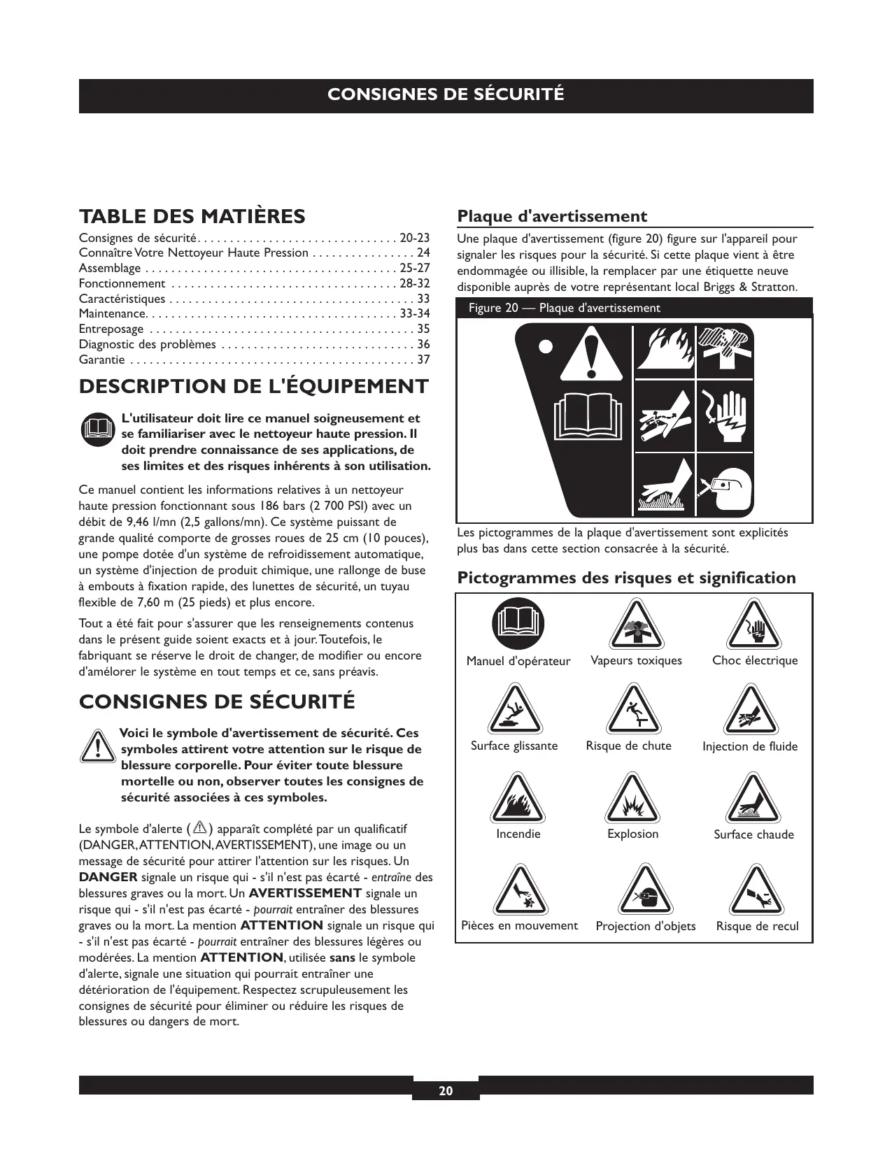 - Plaque d'avertissement Consignes de sécurité p. 20