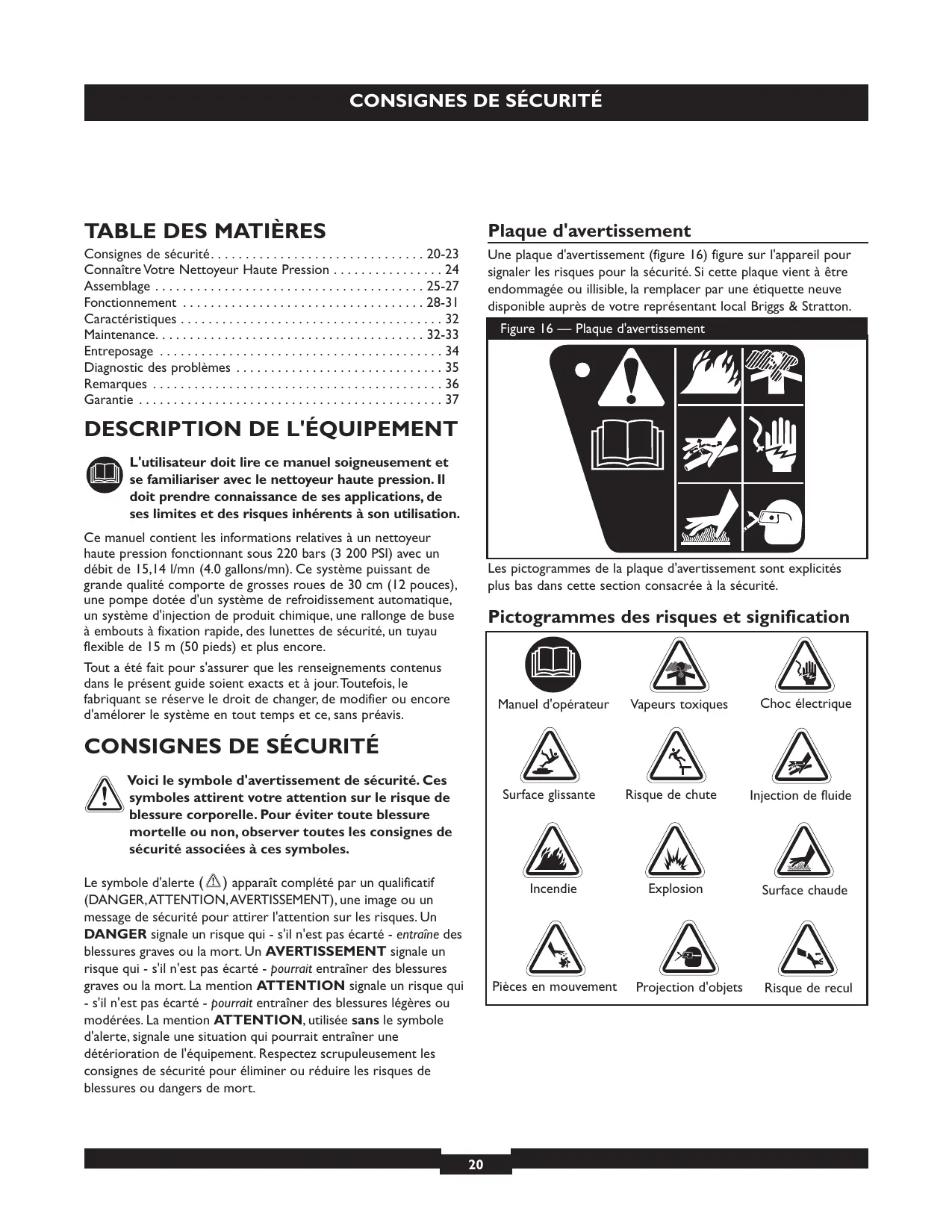 L'utilisateur doit lire ce manuel soigneusement et se familiariser avec le nettoyeur haute pression. Il doit prendre connaissance de ses applications, de ses limites et des risques inhérents à son utilisation. Ce manuel contient les informations relatives à un nettoyeur haute pression fonctionnant sous 220 bars (3 200 PSI) avec un débit de 15,14 l/mn (4.0 gallons/mn). Ce système puissant de grande qualité comporte de grosses roues de 30 cm (12 pouces), une pompe dotée d'un système de refroidissement automatique, un système d'injection de produit chimique, une rallonge de buse à embouts à fixation rapide, des lunettes de sécurité, un tuyau flexible de 15 m (50 pieds) et plus encore. Les pictogrammes de la plaque d'avertissement sont explicités plus bas dans cette section consacrée à la sécurité. Pictogrammes des risques et signification Tout a été fait pour s'assurer que les renseignements contenus dans le présent guide soient exacts et à jour.Toutefois, le fabriquant se réserve le droit de changer, de modifier ou encore d'amélorer le système en tout temps et ce, sans préavis. Manuel d'opérateur Vapeurs toxiques Choc électrique