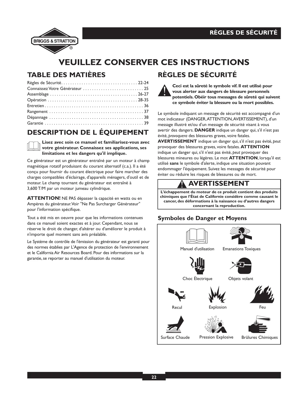 Lisez avec soin ce manuel et familiarisez-vous avec votre générateur. Connaissez ses applications, ses limitations et les dangers qu'il implique. Ce générateur est un générateur entraîné par un moteur à champ magnétique rotatif produisant du courant alternatif (c.a.). Il a été conçu pour fournir du courant électrique pour faire marcher des charges compatibles d'éclairage, d'appareils ménagers, d'outil et de moteur. Le champ tournant du générateur est entraîné à 3,600 T/M par un moteur jumeau cylindrique. AVERTISSEMENT L’échappement du moteur de ce produit contient des produits chimiques que l’État de Californie considère comme causant le cancer, des déformations à la naissance ou d’autres dangers concernant la reproduction. ATTENTION! NE PAS dépasser la capacité en watts ou en Ampères du générateur.Voir "Ne Pas Surcharger Générateur" pour l'information spécifique. Symboles de Danger et Moyens Tout a été mis en oeuvre pour que les informations contenues dans ce manuel soient exactes et à jour. Cependant, nous se réserve le droit de changer, d'altérer ou d'améliorer le produit à n'importe quel moment sans avis préalable. Le Système de contrôle de l'émission du générateur est garanti pour des normes établies par L'Agence de protection de l'environnement et le California Air Resources Board. Pour des informations sur la garantie, se reporter au manuel d'utilisation du moteur. Manuel d'utilisation Emanations Toxiques Choc Électrique Objets volant Recul Surface Chaude