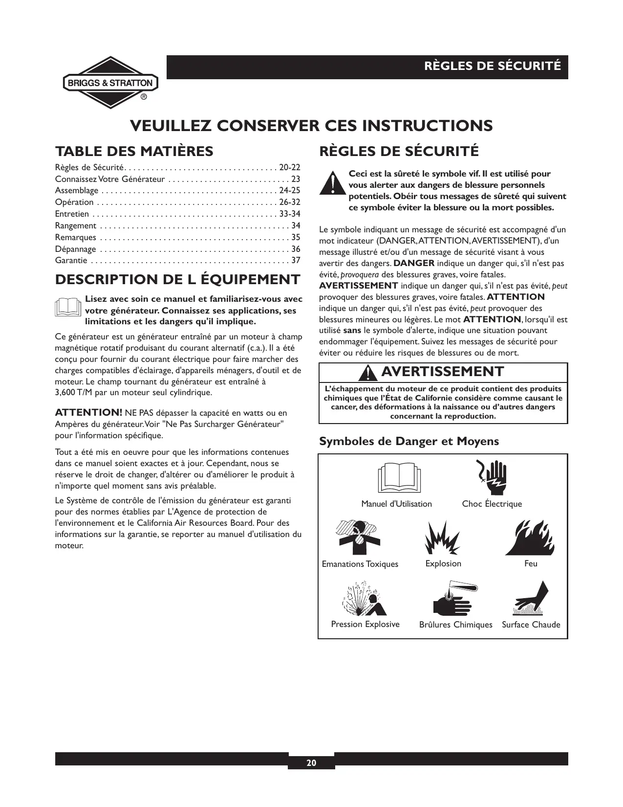 Lisez avec soin ce manuel et familiarisez-vous avec votre générateur. Connaissez ses applications, ses limitations et les dangers qu'il implique. Ce générateur est un générateur entraîné par un moteur à champ magnétique rotatif produisant du courant alternatif (c.a.). Il a été conçu pour fournir du courant électrique pour faire marcher des charges compatibles d'éclairage, d'appareils ménagers, d'outil et de moteur. Le champ tournant du générateur est entraîné à 3,600 T/M par un moteur seul cylindrique. AVERTISSEMENT L’échappement du moteur de ce produit contient des produits chimiques que l’État de Californie considère comme causant le cancer, des déformations à la naissance ou d’autres dangers concernant la reproduction. ATTENTION! NE PAS dépasser la capacité en watts ou en Ampères du générateur.Voir "Ne Pas Surcharger Générateur" pour l'information spécifique. Symboles de Danger et Moyens Tout a été mis en oeuvre pour que les informations contenues dans ce manuel soient exactes et à jour. Cependant, nous se réserve le droit de changer, d'altérer ou d'améliorer le produit à n'importe quel moment sans avis préalable. Le Système de contrôle de l'émission du générateur est garanti pour des normes établies par L'Agence de protection de l'environnement et le California Air Resources Board. Pour des informations sur la garantie, se reporter au manuel d'utilisation du moteur. Manuel d'Utilisation Emanations Toxiques Pression Explosive