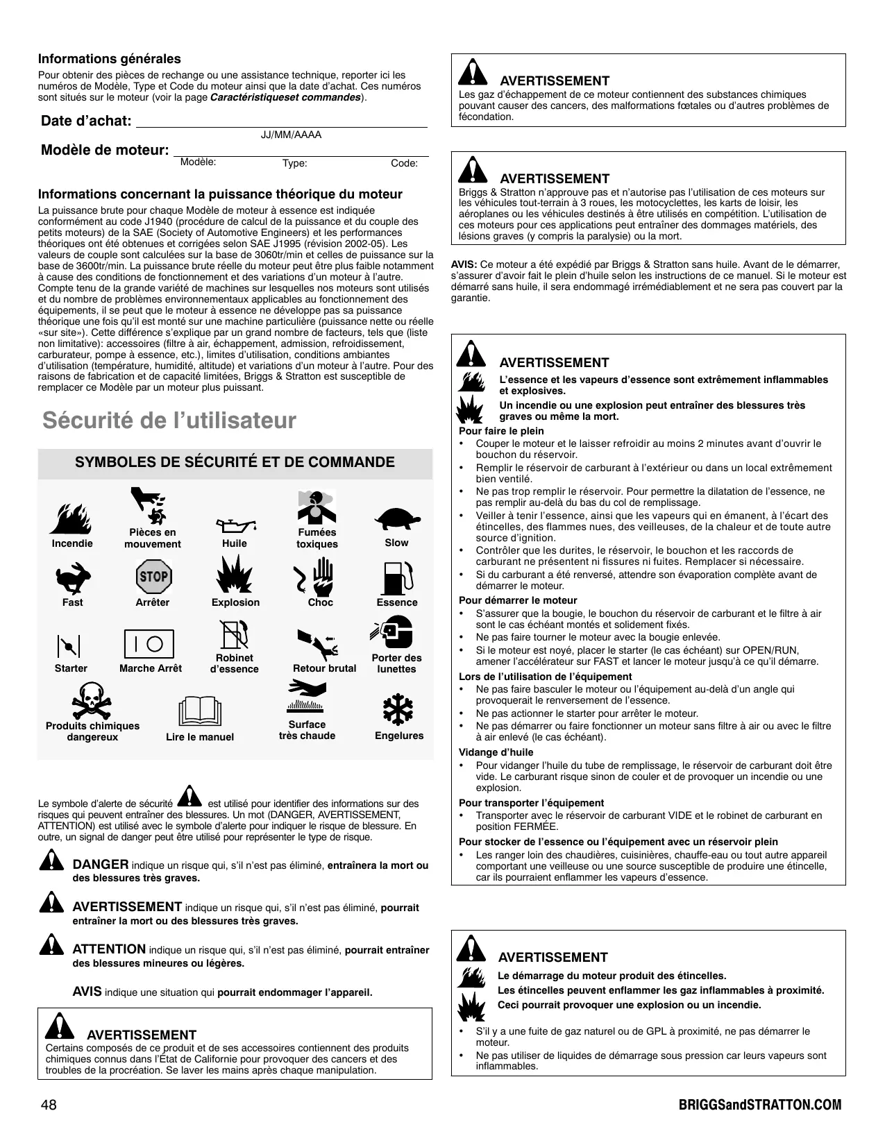 Modèle de moteur: Modèle: Type: Code: Informations concernant la puissance théorique du moteur La puissance brute pour chaque Modèle de moteur à essence est indiquée conformément au code J1940 (procédure de calcul de la puissance et du couple des petits moteurs) de la SAE (Society of Automotive Engineers) et les performances théoriques ont été obtenues et corrigées selon SAE J1995 (révision 2002-05). Les valeurs de couple sont calculées sur la base de 3060tr/min et celles de puissance sur la base de 3600tr/min. La puissance brute réelle du moteur peut être plus faible notamment à cause des conditions de fonctionnement et des variations d’un moteur à l’autre. Compte tenu de la grande variété de machines sur lesquelles nos moteurs sont utilisés et du nombre de problèmes environnementaux applicables au fonctionnement des équipements, il se peut que le moteur à essence ne développe pas sa puissance théorique une fois qu’il est monté sur une machine particulière (puissance nette ou réelle «sur site»). Cette différence s’explique par un grand nombre de facteurs, tels que (liste non limitative): accessoires (filtre à air, échappement, admission, refroidissement, carburateur, pompe à essence, etc.), limites d’utilisation, conditions ambiantes d’utilisation (température, humidité, altitude) et variations d’un moteur à l’autre. Pour des raisons de fabrication et de capacité limitées, Briggs & Stratton est susceptible de remplacer ce Modèle par un moteur plus puissant. Sécurité de l’utilisateur SYMBOLES DE SÉCURITÉ ET DE COMMANDE Incendie Pièces en mouvement Huile Fast Arrêter Explosion Starter Marche Arrêt Robinet d’essence Produits chimiques dangereux Lire le manuel Fumées toxiques Slow Essence Choc Retour brutal Porter des lunettes Surface très chaude Engelures AVERTISSEMENT Briggs & Stratton n’approuve pas et n’autorise pas l’utilisation de ces moteurs sur les véhicules tout-terrain à 3 roues, les motocyclettes, les karts de loisir, les aéroplanes ou les véhicules destinés à être utilisés en compétition. L’utilisation de ces moteurs pour ces applications peut entraîner des dommages matériels, des lésions graves (y compris la paralysie) ou la mort. AVIS: Ce moteur a été expédié par Briggs & Stratton sans huile. Avant de le démarrer, s’assurer d’avoir fait le plein d’huile selon les instructions de ce manuel. Si le moteur est démarré sans huile, il sera endommagé irrémédiablement et ne sera pas couvert par la garantie. AVERTISSEMENT L’essence et les vapeurs d’essence sont extrêmement inflammables et explosives. Un incendie ou une explosion peut entraîner des blessures très graves ou même la mort. Pour faire le plein