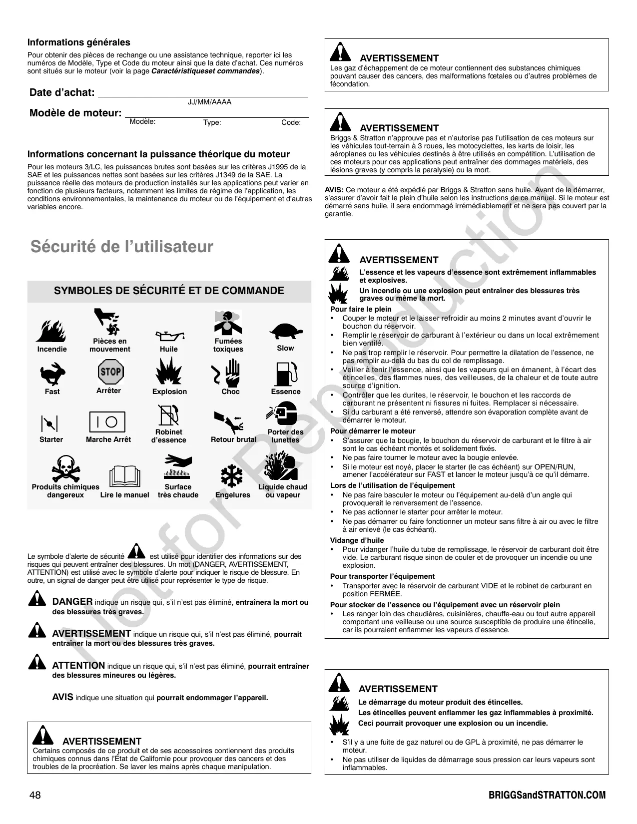 Modèle: Type: Code: Informations concernant la puissance théorique du moteur AVIS: Ce moteur a été expédié par Briggs & Stratton sans huile. Avant de le démarrer, s’assurer d’avoir fait le plein d’huile selon les instructions de ce manuel. Si le moteur est démarré sans huile, il sera endommagé irrémédiablement et ne sera pas couvert par la garantie. tio Pour les moteurs 3/LC, les puissances brutes sont basées sur les critères J1995 de la SAE et les puissances nettes sont basées sur les critères J1349 de la SAE. La puissance réelle des moteurs de production installés sur les applications peut varier en fonction de plusieurs facteurs, notamment les limites de régime de l’application, les conditions environnementales, la maintenance du moteur ou de l’équipement et d’autres variables encore. AVERTISSEMENT Briggs & Stratton n’approuve pas et n’autorise pas l’utilisation de ces moteurs sur les véhicules tout-terrain à 3 roues, les motocyclettes, les karts de loisir, les aéroplanes ou les véhicules destinés à être utilisés en compétition. L’utilisation de ces moteurs pour ces applications peut entraîner des dommages matériels, des lésions graves (y compris la paralysie) ou la mort.