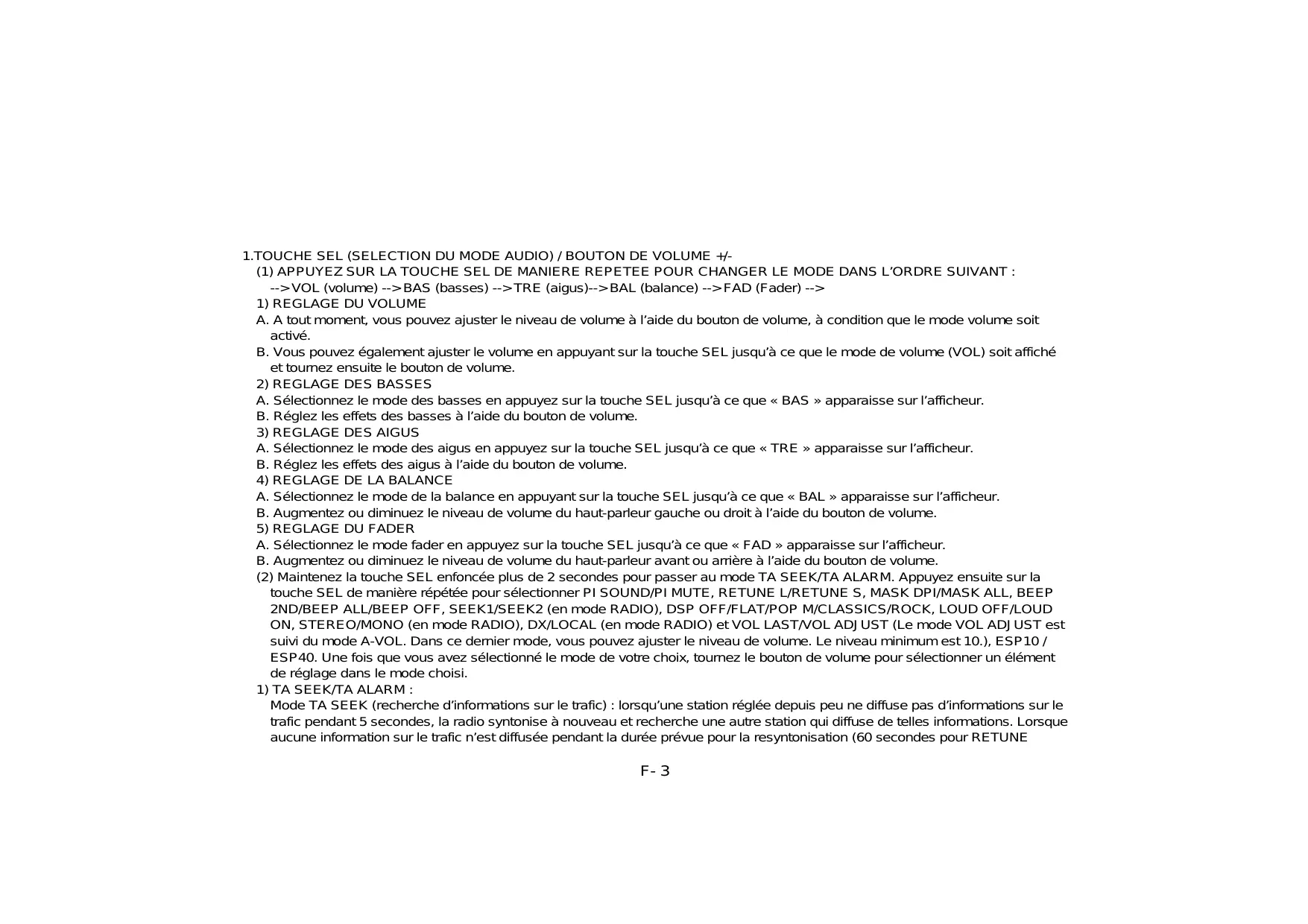 (1) APPUYEZ SUR LA TOUCHE SEL DE MANIÈRE REPÉTEE POUR CHANGER LE MODE DANS L'ORDRE SUIVANT : -> VOL (volume) -> BAS (basses) -> TRE (aigus) -> BAL (balance) -> FAD (Fader) ->