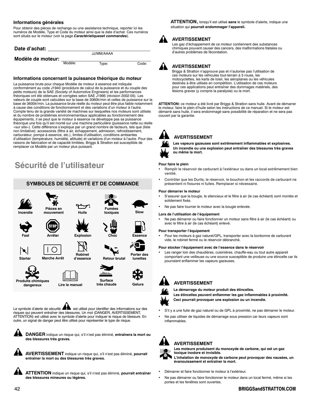 Modèle de moteur: Modèle: Type: Code: AVERTISSEMENT Briggs & Stratton n’approuve pas et n’autorise pas l’utilisation de ces moteurs sur les véhicules tout-terrain à 3 roues, les motocyclettes, les karts de loisir, les aéroplanes ou les véhicules destinés à être utilisés en compétition. L’utilisation de ces moteurs pour ces applications peut entraîner des dommages matériels, des lésions graves (y compris la paralysie) ou la mort. Informations concernant la puissance théorique du moteur La puissance brute pour chaque Modèle de moteur à essence est indiquée conformément au code J1940 (procédure de calcul de la puissance et du couple des petits moteurs) de la SAE (Society of Automotive Engineers) et les performances théoriques ont été obtenues et corrigées selon SAE J1995 (révision 2002-05). Les valeurs de couple sont calculées sur la base de 3060tr/min et celles de puissance sur la base de 3600tr/min. La puissance brute réelle du moteur peut être plus faible notamment à cause des conditions de fonctionnement et des variations d’un moteur à l’autre. Compte tenu de la grande variété de machines sur lesquelles nos moteurs sont utilisés et du nombre de problèmes environnementaux applicables au fonctionnement des équipements, il se peut que le moteur à essence ne développe pas sa puissance théorique une fois qu’il est monté sur une machine particulière (puissance nette ou réelle «sur site»). Cette différence s’explique par un grand nombre de facteurs, tels que (liste non limitative): accessoires (filtre à air, échappement, admission, refroidissement, carburateur, pompe à essence, etc.), limites d’utilisation, conditions ambiantes d’utilisation (température, humidité, altitude) et variations d’un moteur à l’autre. Pour des raisons de fabrication et de capacité limitées, Briggs & Stratton est susceptible de remplacer ce Modèle par un moteur plus puissant. Sécurité de l’utilisateur ATTENTION: ce moteur a été livré par Briggs & Stratton sans huile. Avant de démarrer le moteur, faire le plein d’huile selon les instructions de ce manuel. Si le moteur est démarré sans huile, il sera endommagé sans possibilité de réparation et ne sera pas couvert par la garantie. AVERTISSEMENT Les vapeurs gazeuses sont extrêmement inflammables et explosives. Un incendie ou une explosion peut entraîner des blessures très graves ou même la mort. Pour faire le plein