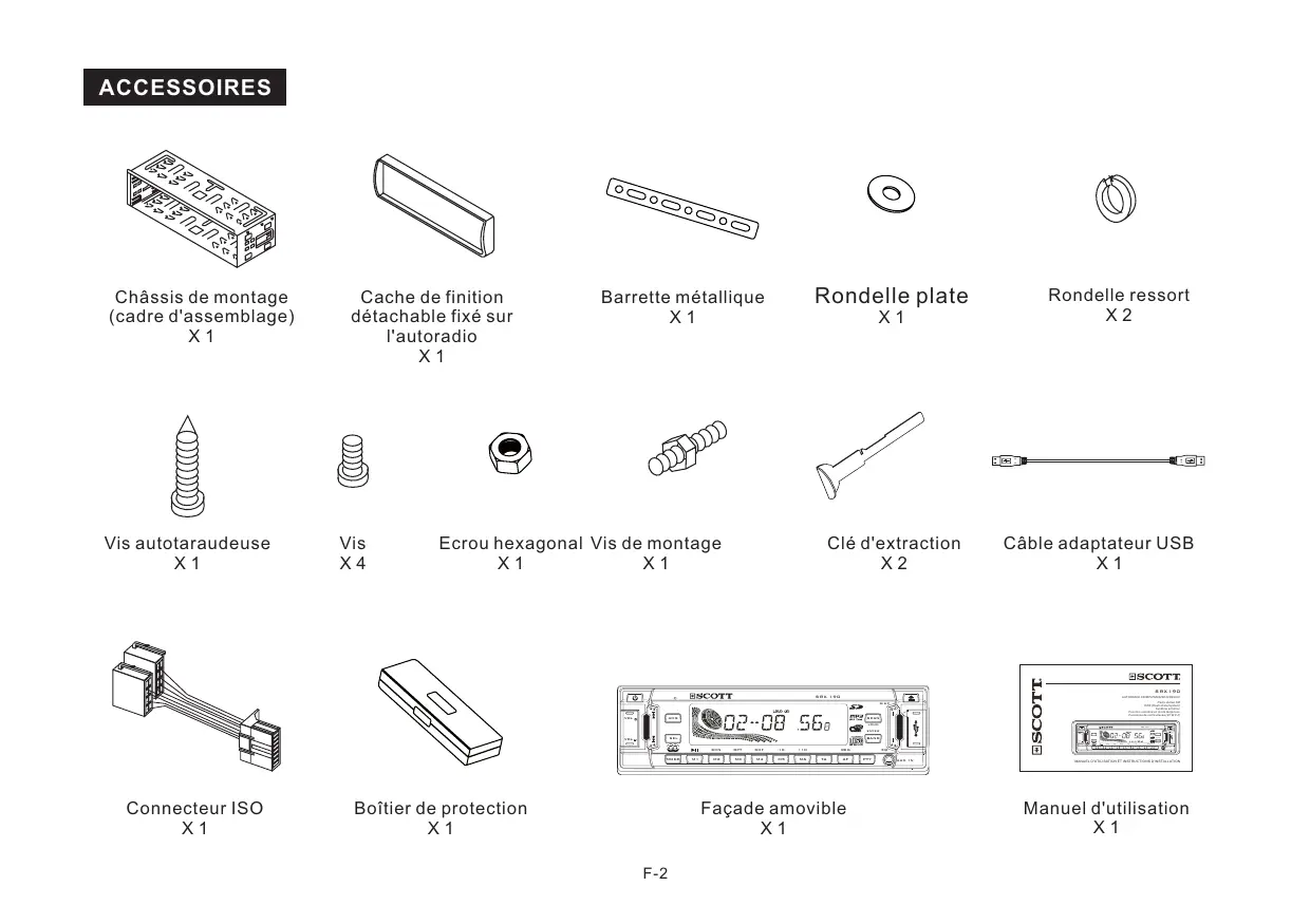 TABLE DES MATIÈRES F-1 ACCESSOIRES F-2 SÉCURITÉ F-3 INSTALLATION F-4 UTILISATION DE LA FACADE AMOVIBLE F-7 CONNEXIONS F-8 DESCRIPTION DE L'AUTORADIO F-9 EMPLACEMENT DES TOUCHES ET COMMANDES F-9 CONSIGNES D'UTILISATION GÉNÉRALE F-10 FONCTION RADIO F-14 SYSTÈME RDS (RADIO DATA SYSTEM) F-15 LECTEUR CD/MP3/WMA F-17 UTILISATION DE CARTES MÉMOIRE SD/MMC F-19 UTILISATION DE PÉRIPHÉRIQUES USB F-20 UTILISATION DE L'ENTRÉE AUXILIAIRE F-20 REMARQUES SUR LES DISQUES F-21 CARACTÉRISTIQUES TECHNIQUES F-23 GUIDE DE DÉPANNAGE F-24