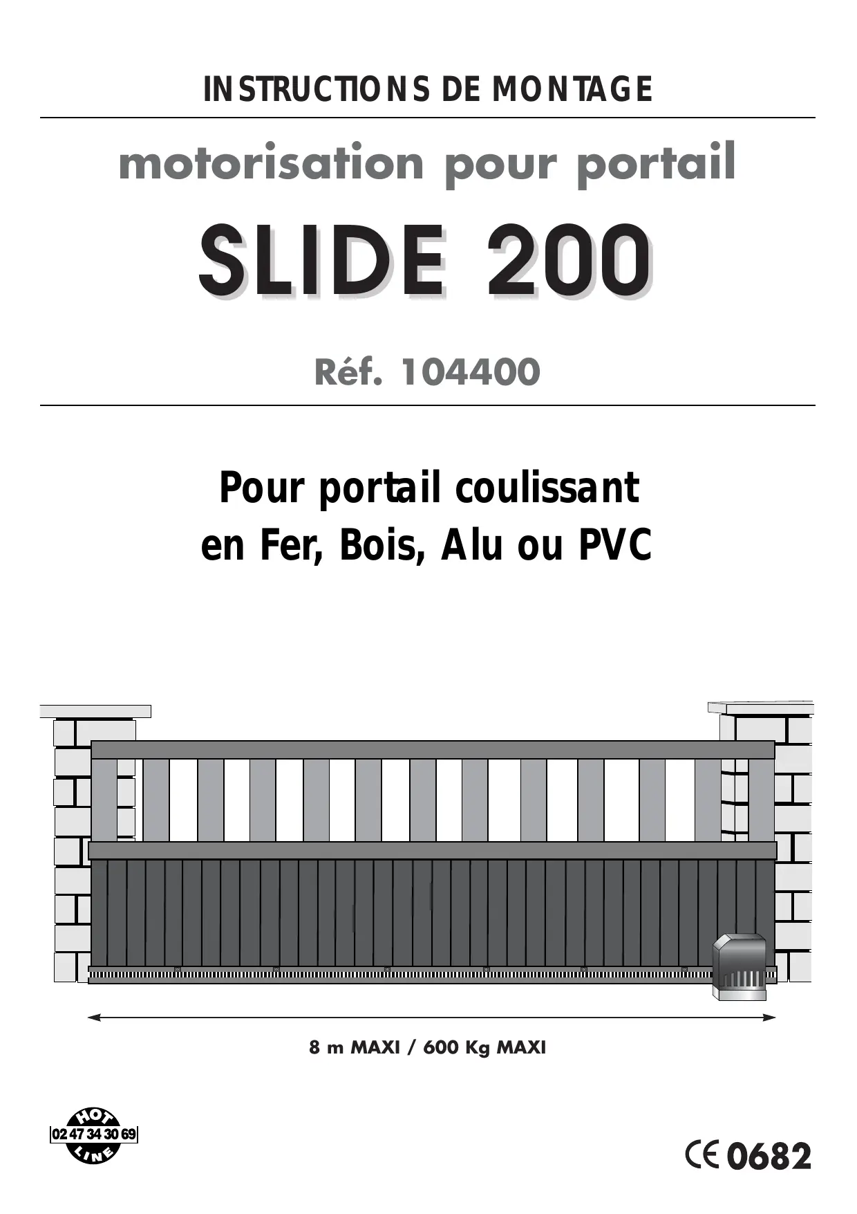 Malgré le soin que nous avons apporté à la conception de nos produits et à la réalisation de cette notice, vous avez peut-ëtre des difficultés pour installer votre automatisme ou des questions sans réponses. N’hésitez pas à nous contactez, nos spécialistes sont à votre disposition pour vous conseiller. Du lundi au samedi de 8H30 à 12H30 et de 14H à 18H. Munissez-vous des informations suivantes avant tout appel : -Modèle de l’automatisme : SLIDE 200 -Caractéristiques de votre portail : .Dimensions du portail : ............................ .Type (bois, métal,....) : ................................. .Ajouré ou plein : .......................................... Pour un problème de réglage ou de fonctionnement, nous contacter devant votre installation avec le portail fermé et le boîtier électronique ouvert.