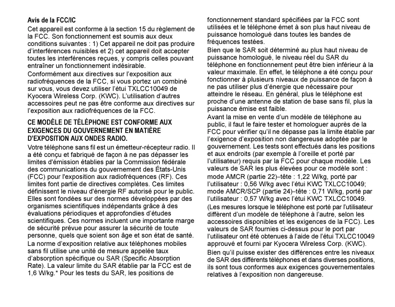 D’EXPOSITION AUX ONDES RADIO. Votre téléphone sans fil est un émetteur-récepteur radio. Il a été conçu et fabriqué de façon à ne pas dépasser les limites d'émission établies par la Commission fédérale des communications du gouvernement des États-Unis (FCC) pour l'exposition aux radiofréquences (RF). Ces limites font partie de directives complètes. Ces limites définissent le niveau d'énergie RF autorisé pour le public. Elles sont fondées sur des normes développées par des organismes scientifiques indépendants grâce à des évaluations périodiques et approfondies d’études scientifiques. Ces normes incluent une importante marge de sécurité prévue pour assurer la sécurité de toute personne, quels que soient son âge et son état de santé. La norme d’exposition relative aux téléphones mobiles sans fil utilise une unité de mesure appelée taux d’absorption spécifique ou SAR (Specific Absorption Rate). La valeur limite du SAR établie par la FCC est de 1,6 W/kg.* Pour les tests du SAR, les positions de fonctionnement standard spécifiées par la FCC sont utilisées et le téléphone émet à son plus haut niveau de puissance homologué dans toutes les bandes de fréquences testées. Bien que le SAR soit déterminé au plus haut niveau de puissance homologué, le niveau réel du SAR du téléphone en fonctionnement peut être bien inférieur à la valeur maximale. En effet, le téléphone a été conçu pour fonctionner à plusieurs niveaux de puissance de façon à ne pas utiliser plus d’énergie que nécessaire pour atteindre le réseau. En général, plus le téléphone est proche d’une antenne de station de base sans fil, plus la puissance émise est faible. Avant la mise en vente d’un modèle de téléphone au public, il faut le faire tester et homologuer auprès de la FCC pour vérifier qu’il ne dépasse pas la limite établie par l’exigence d’exposition non dangereuse adoptée par le gouvernement. Les tests sont effectués dans les positions et aux endroits (par exemple à l’oreille et porté par l’utilisateur) requis par la FCC pour chaque modèle. Les valeurs de SAR les plus élevées pour ce modèle sont : mode AMCR (partie 22)Ótête : 1,22 W/kg, porté par l’utilisateur : 0,56 W/kg avec l’étui KWC TXLCC10049; mode AMCR/SCP (partie 24)Ótête : 0,71 W/kg, porté par l’utilisateur : 0,57 W/kg avec l’étui KWC TXLCC10049. (Les mesures lorsque le téléphone est porté par l’utilisateur diffèrent d’un modèle de téléphone à l’autre, selon les accessoires disponibles et les exigences de la FCC). Les valeurs de SAR fournies ci-dessus pour le port par l’utilisateur ont été obtenues à l’aide de l’étui TXLCC10049 approuvé et fourni par Kyocera Wireless Corp. (KWC). Bien qu’il puisse exister des différences entre les niveaux de SAR des différents téléphones et dans diverses positions, ils sont tous conformes aux exigences gouvernementales relatives à l’exposition non dangereuse. La FCC a accordé une autorisation d’équipement pour ce modèle de téléphone. Tous les niveaux de SAR mesurés ont été jugés conformes aux directives d’émission RF de la FCC. Les valeurs de SAR de ce modèle de téléphone sont archivées par la FCC. Elles peuvent être consultées sous la section Display Grant du site http://www.fcc.gov/oet/fccid après avoir recherché le numéro d’identification FCC OVFKWC-SE47. D’autres informations sur le SAR sont disponibles sur le site Web de la CTIA (Cellular Telecommunications and Internet Association) à l’adresse http://www.wow-com.com.