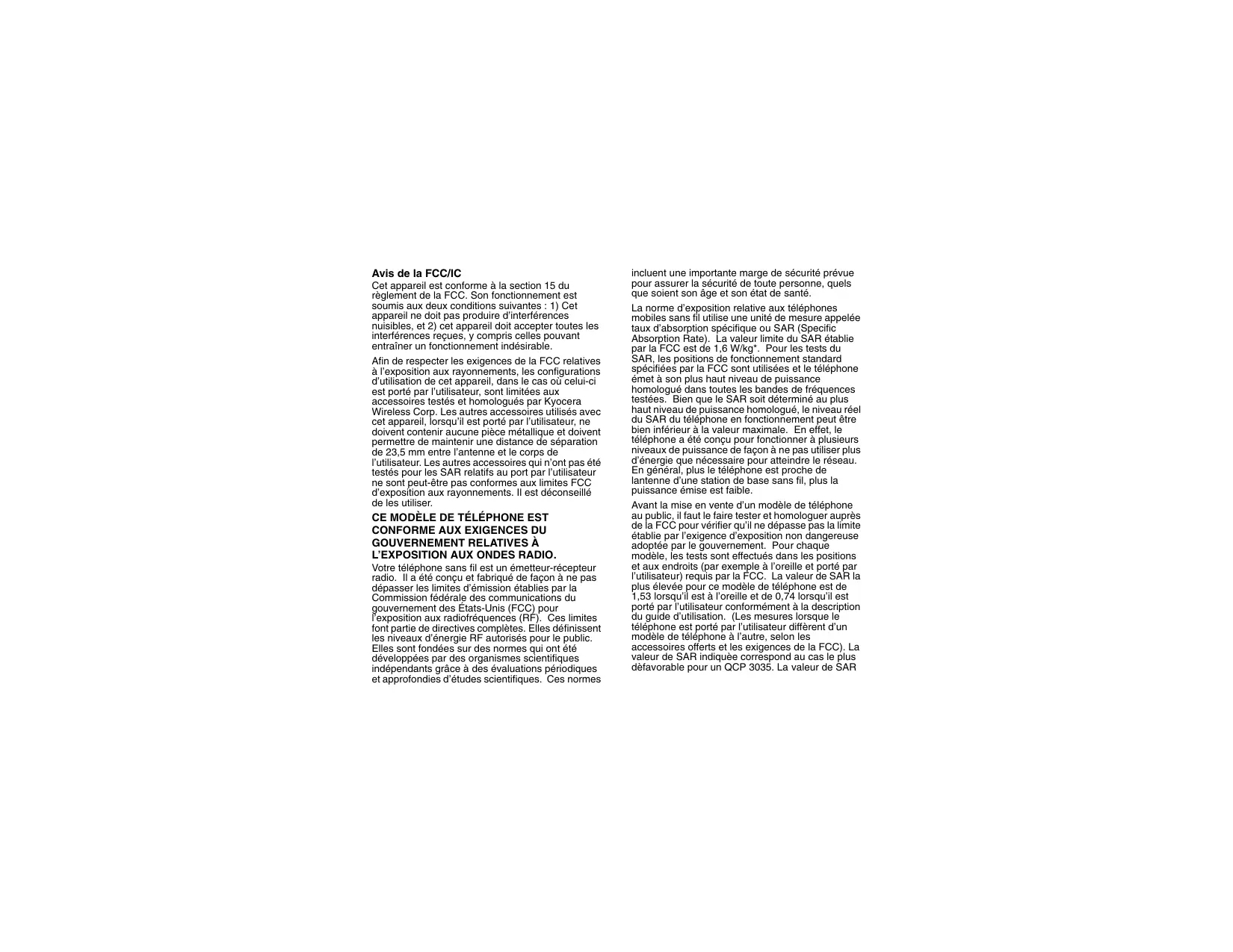 GOUVERNEMENT RELATIVES À L’EXPOSITION AUX ONDES RADIO. Votre téléphone sans fil est un émetteur-récepteur radio. Il a été conçu et fabriqué de façon à ne pas dépasser les limites d’émission établies par la Commission fédérale des communications du gouvernement des États-Unis (FCC) pour l’exposition aux radiofréquences (RF). Ces limites font partie de directives complètes. Elles définissent les niveaux d’énergie RF autorisés pour le public. Elles sont fondées sur des normes qui ont été développées par des organismes scientifiques indépendants grâce à des évaluations périodiques et approfondies d’études scientifiques. Ces normes incluent une importante marge de sécurité prévue pour assurer la sécurité de toute personne, quels que soient son âge et son état de santé. La norme d’exposition relative aux téléphones mobiles sans fil utilise une unité de mesure appelée taux d’absorption spécifique ou SAR (Specific Absorption Rate). La valeur limite du SAR établie par la FCC est de 1,6 W/kg*. Pour les tests du SAR, les positions de fonctionnement standard spécifiées par la FCC sont utilisées et le téléphone émet à son plus haut niveau de puissance homologué dans toutes les bandes de fréquences testées. Bien que le SAR soit déterminé au plus haut niveau de puissance homologué, le niveau réel du SAR du téléphone en fonctionnement peut être bien inférieur à la valeur maximale. En effet, le téléphone a été conçu pour fonctionner à plusieurs niveaux de puissance de façon à ne pas utiliser plus d’énergie que nécessaire pour atteindre le réseau. En général, plus le téléphone est proche de lantenne d’une station de base sans fil, plus la puissance émise est faible. Avant la mise en vente d’un modèle de téléphone au public, il faut le faire tester et homologuer auprès de la FCC pour vérifier qu’il ne dépasse pas la limite établie par l’exigence d’exposition non dangereuse adoptée par le gouvernement. Pour chaque modèle, les tests sont effectués dans les positions et aux endroits (par exemple à l’oreille et porté par l’utilisateur) requis par la FCC. La valeur de SAR la plus élevée pour ce modèle de téléphone est de 1,53 lorsqu’il est à l’oreille et de 0,74 lorsqu’il est porté par l’utilisateur conformément à la description du guide d’utilisation. (Les mesures lorsque le téléphone est porté par l’utilisateur diffèrent d’un modèle de téléphone à l’autre, selon les accessoires offerts et les exigences de la FCC). La valeur de SAR indiquèe correspond au cas le plus dèfavorable pour un QCP 3035. La valeur de SAR d’un QCP 3035 est en moyenne de 1,26 lorsqu’il est à l’oreille et de 0,61 lorsqu’il est porté par l’utilisateur. Bien qu’il puisse y avoir des différences entre les niveaux de SAR des différents téléphones et dans les différentes positions, ils sont tous conformes aux exigences gouvernementales relatives à l’exposition non dangereuse. La FCC a accordé une autorisation d’équipement pour ce modèle de téléphone. Tous les niveaux de SAR mesurés ont été jugés conformes aux directives d’émission RF de la FCC. Les valeurs de SAR de ce modèle de téléphone sont archivées par la FCC. Elles figurent dans la section Display Grant du site http:// www.fcc.gov/oet/fccid et correspondent à un numéro d’identification FCC OVFQCP-3035. D’autres informations sur le taux d’absorption spécifique (SAR) se trouvent sur le site Internet de la CTIA (Cellular Telecommunications Industry Association) à l’adresse http://www.wow-com.com.